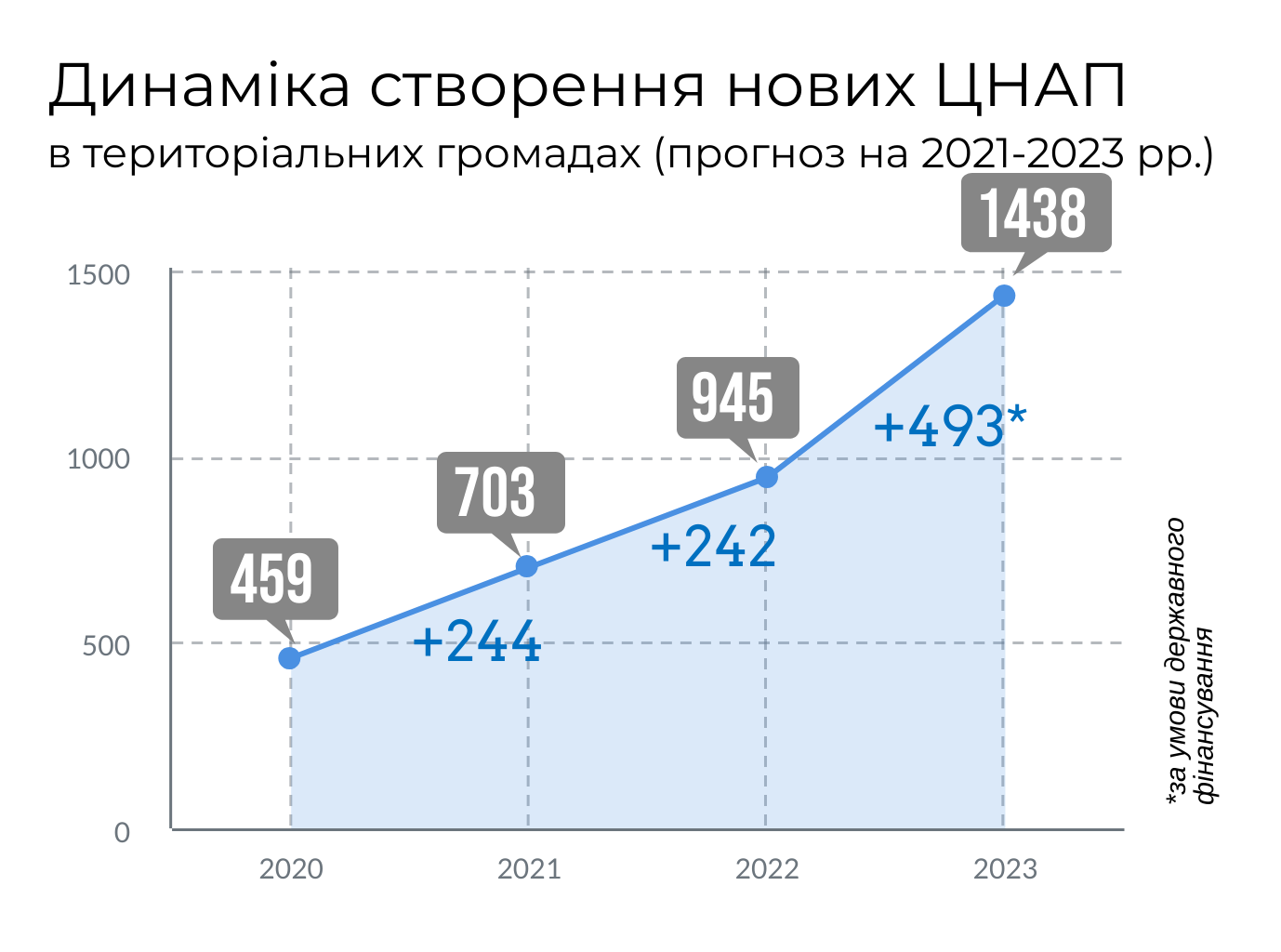 Як показує діаграма, за умови дотримання умов Закону, у 2021 та 2022 рр. щорічний приріст буде як мінімум +240 нових ЦНАП, а до кінця 2023, у разі виділення відповідного державного фінансування, в усіх тергромадах мають бути утворені нові ЦНАП. Зауважу, що діаграма показує мінімальні величини приросту нових ЦНАП. Передбачаю, що за належного державного фінансування, у наступні два роки приріст нових ЦНАП може становит по +400 нових ЦНАП щорічно.