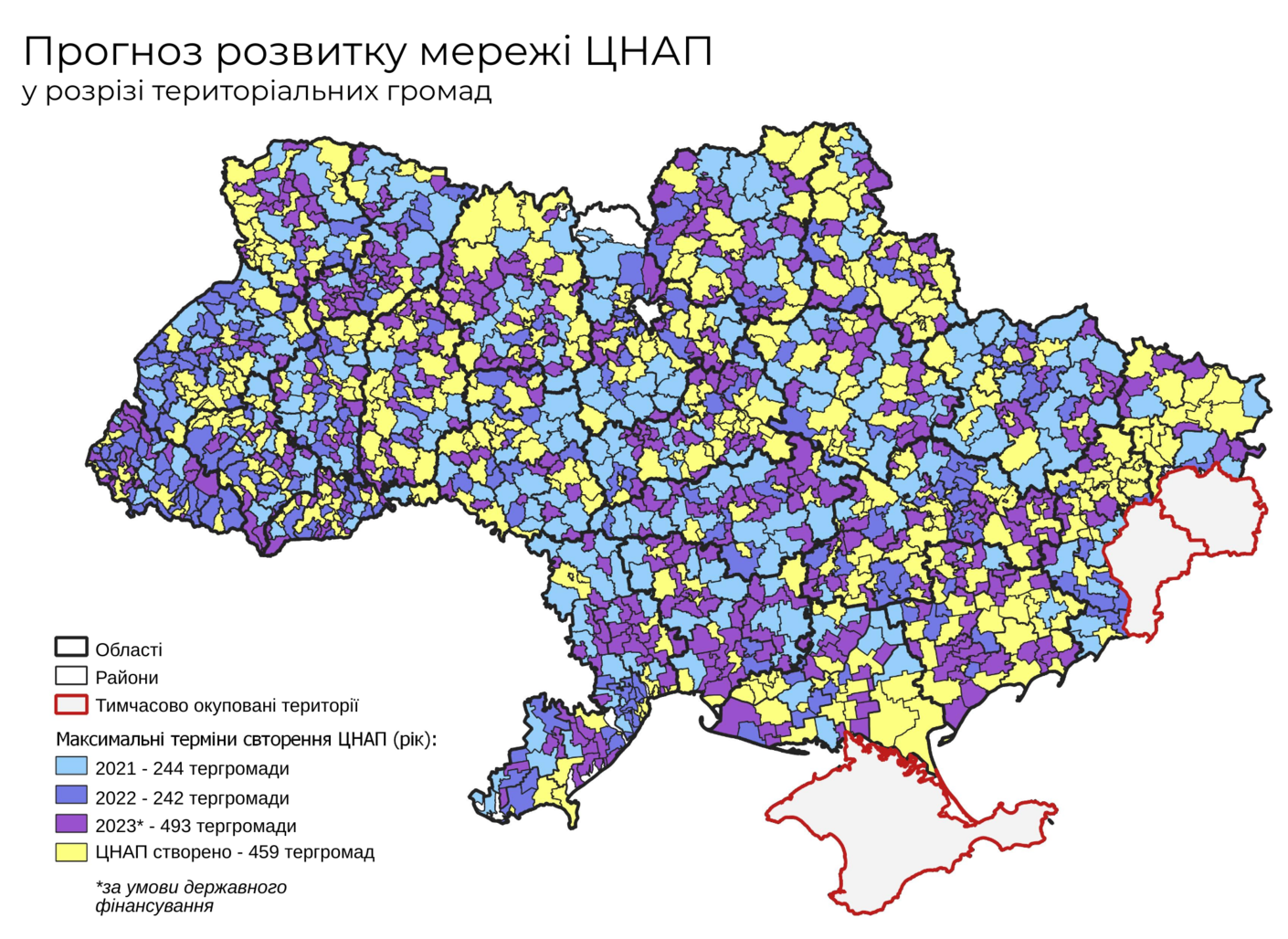 Отже, на основі законодавчих змін прогноз розвитку мережі ЦНАП є оптимістистим, відповідно до якого як мінімум 945 тергромад (65,7%) на кінець 2023 року будуть мати власні ЦНАП. У цих тергромадах буде проживати близко 93% всього населення. А от за найоптимістичним прогнозом, за умови належного державної підтримки, всі тергромади відкриють власні ЦНАП.