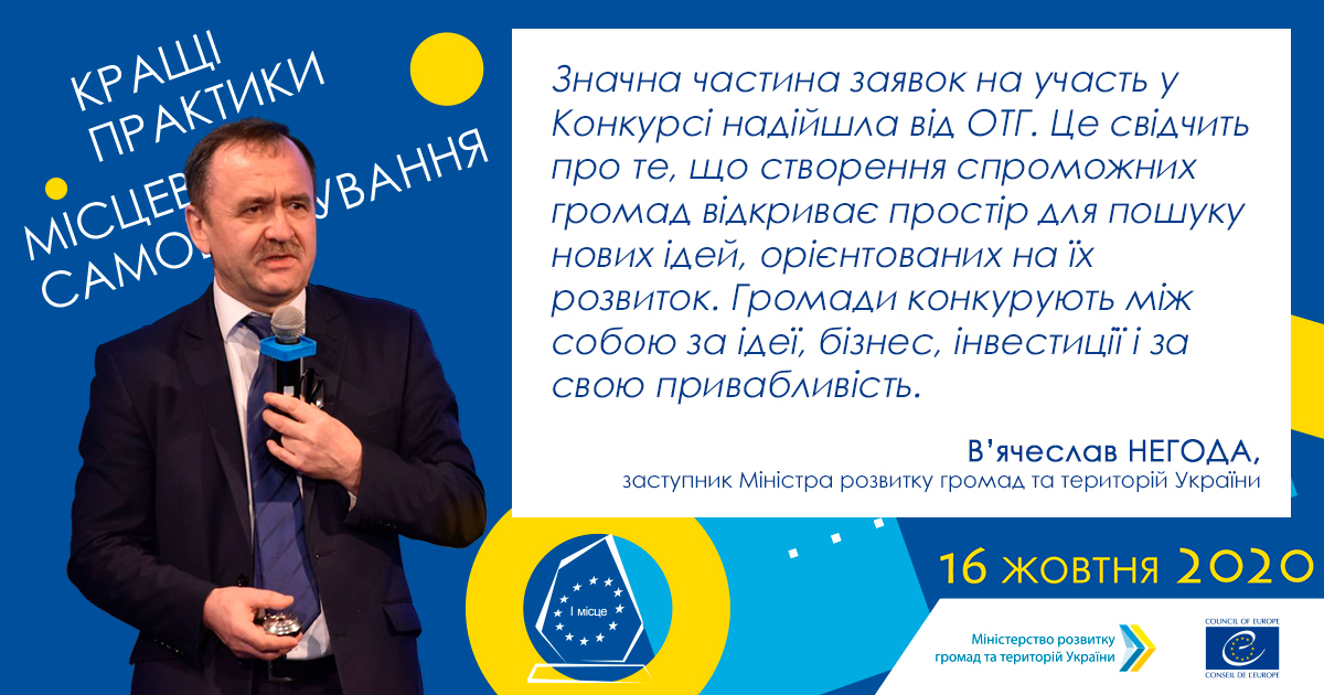 «Державі важливо, щоб про результати «Кращих практик», досягнення, про які в них йдеться, прізвища ініціативних очільників цих органів місцевого самоврядування знав якомога ширший загал, їхній досвід вивчали і наслідували інші громади», – зазначив під час презентації підсумків конкурсу «Кращі практики місцевого самоврядування-2020» заступник Міністра розвитку громад та територій В’ячеслав Негода. - Гадаю, таке суперництво інновацій завжди буде актуальним, бо кожен рік народжує нові виклики та завдання для місцевої влади і кожна громада шукає найефективніші шляхи розв’язання таких проблем».