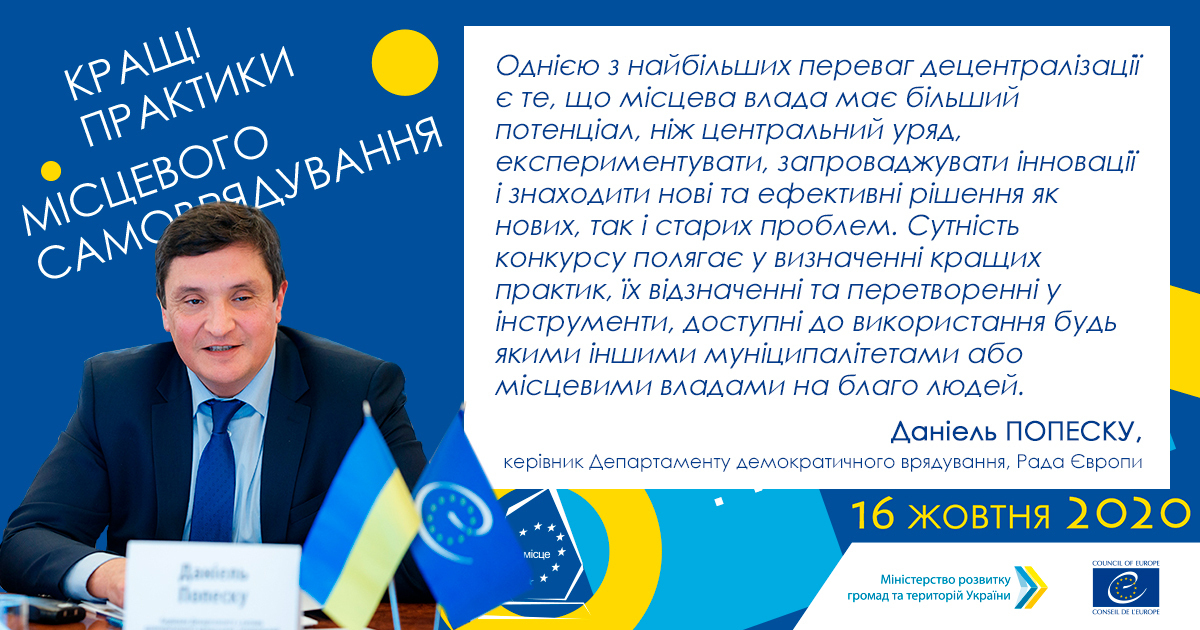 «Однією з найбільших переваг децентралізації є те, що місцева влада має більший потенціал, ніж центральний уряд експериментувати, запроваджувати інновації та знаходити нові ефективні рішення як нових, так і старих проблем». Ці мудрі слова належать Даніелю Попеску, очільнику Департаменту доброго врядування Ради Європи, який доклав чимало зусиль для запровадження на українських теренах європейських стандартів місцевої демократії.