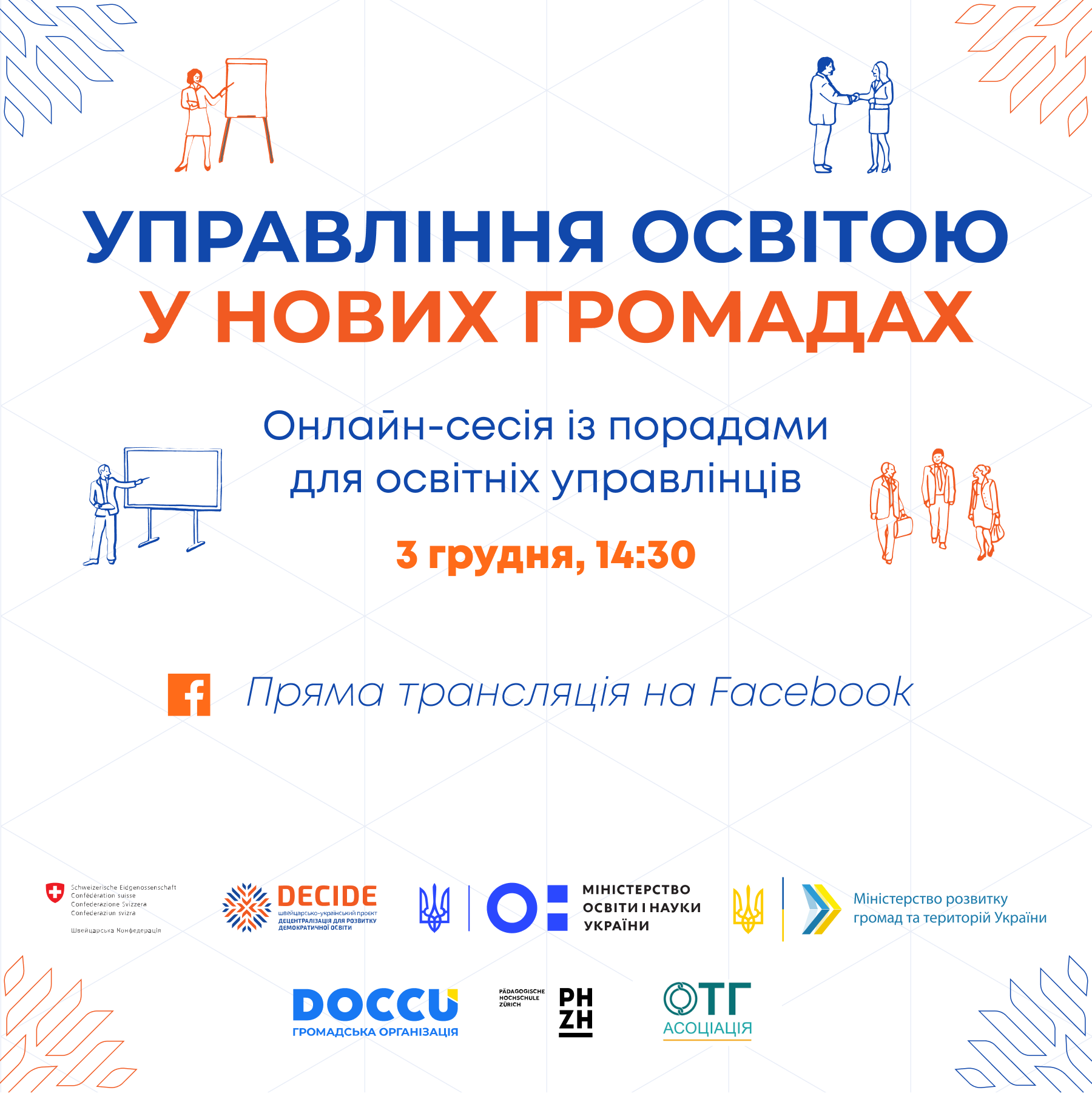 3 грудня 2020 року Міністерство освіти і науки спільно з проєктом DECIDE – «Децентралізація для розвитку демократичної освіти» проведуть онлайн-сесію для освітніх управлінців щодо формування органів управління освітою у новостворених громадах. З-поміж партнерів – Міністерство розвитку громад та територій і Всеукраїнська асоціація ОТГ.