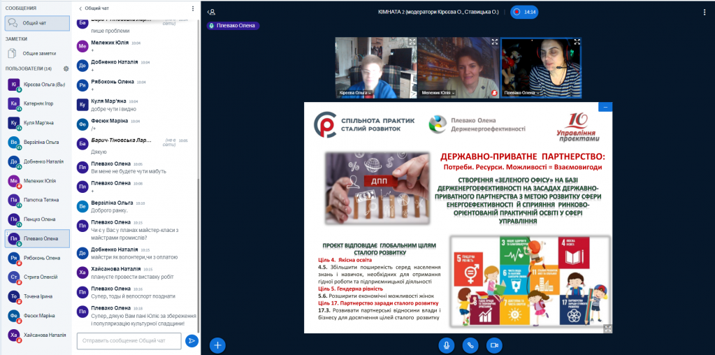 Усі учасники е-курсу спільно здійснили подорож від ідеї до концепції проєкту, їх взаємного оцінювання й надання експертних порад один одному. A особливістю даного навчального курсу стала завершальна онлайн конференція "ТВОРИМО ЗМІНИ РАЗОМ!", впродовж якої було презентовано більше 50 проєктів на теми: