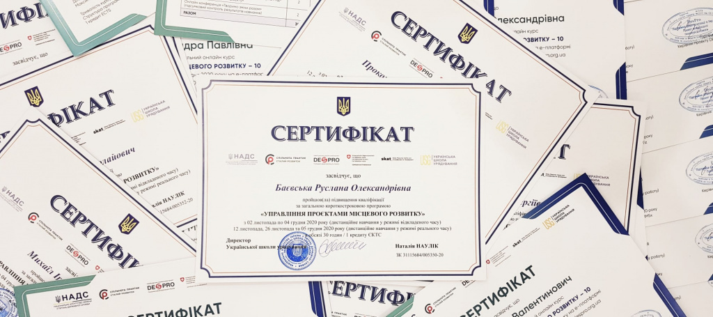 Цього року до ювілейного курсу «Управління проектами місцевого розвитку - 10», що тривав з 1-го листопада до 5-го грудня 2020 року на Спільноті Практик:Сталий Розвиток, долучилося більше 1300 учасників, однак лише 119 учасників змогли виконати всі вимоги короткострокової програми, і тому отримають друковані сертифікати від Українська школа урядування та DESPRO (1 кредит ЄКТС).