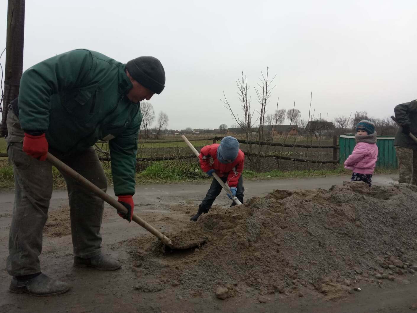 До засипання ям та вирівнювання дороги під час ремонту вулиці Першотравневої у селі Гущинці долучилися і дорослі, і малі. Сільська рада лишень організувала доставлення сюди чотирьох вантажівок щебінки