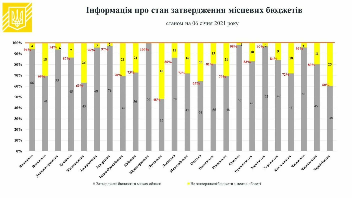 Станом на 6 січня 2021 року, за даними Мінфіну, затверджено 1298 бюджетів, що становить 81% від їх загальної кількості (1597). Зокрема, затверджено: