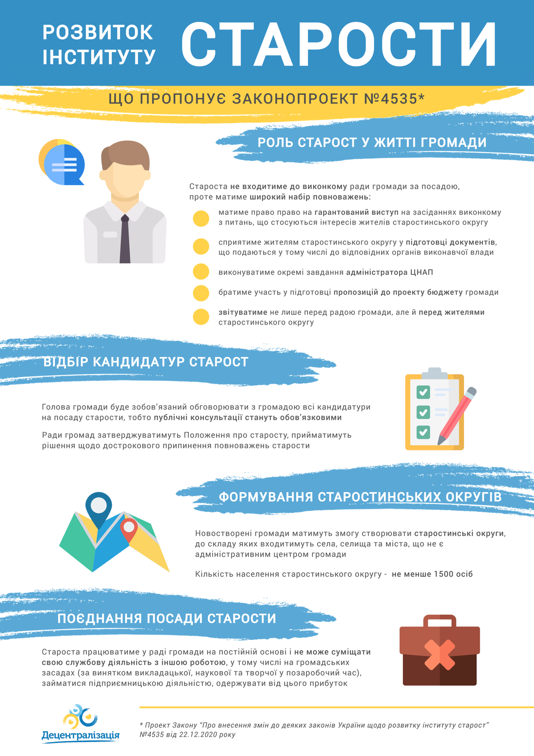 На розгляді Верховної Ради України знаходиться зареєстрований народними депутатами Проект Закону про внесення змін до деяких законів України щодо розвитку інституту старост №4535.
