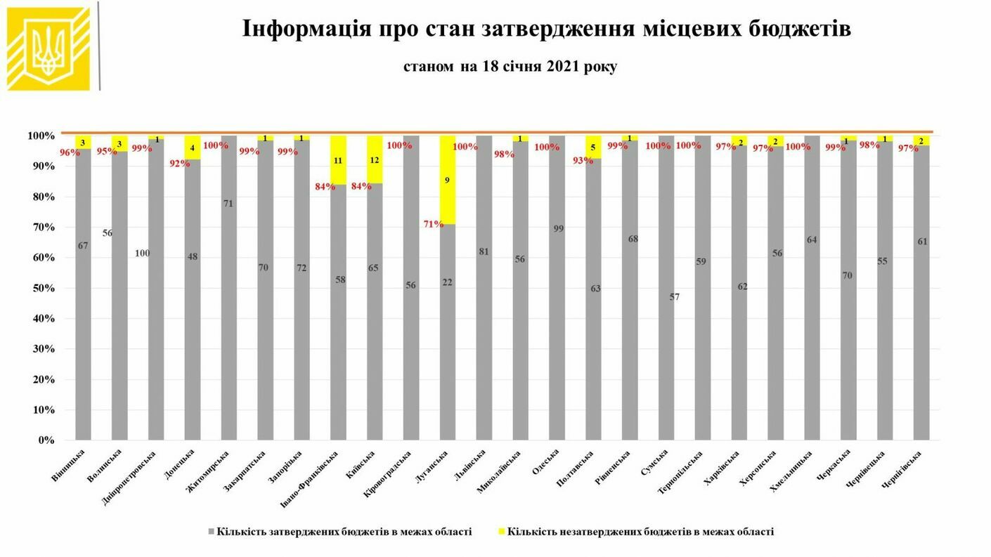 Станом на 18 січня 2021 року в Мінфіні наявна інформація щодо затвердження 1537 бюджетів, що становить 96% від їх загальної кількості (1597). Зокрема, затверджено: