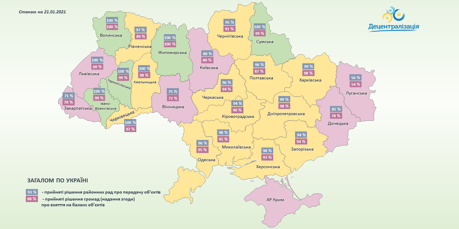 За даними Мінрегіону, лідерами з передачі майна громадам є Житомирська і Волинська області, де громади готові прийняти вже 100% об’єктів.