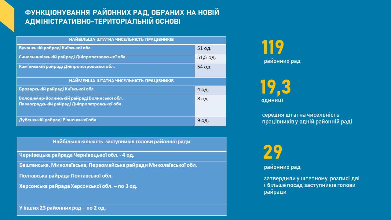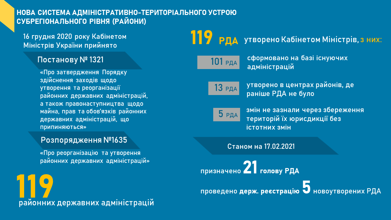За даними моніторингу, вже призначено 21 голову РДА зі 119. Проведено Державну реєстрацію 5 новоутворених РДА.