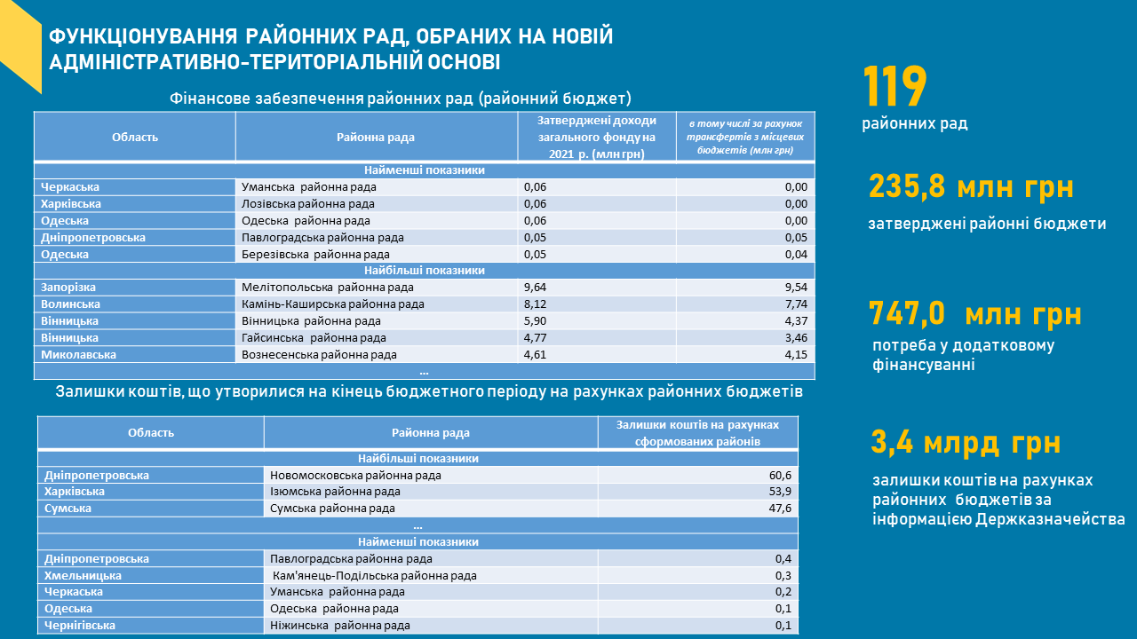 За словами В’ячеслава Негоди, чи не найбільше питань виникає щодо забезпечення функціонування районних рад. «Є районні ради, які мають низькі бюджетні показники. Десь це лише 50 тисяч на рік. Забезпечити функціонування райради за такі гроші неможливо. За розрахунками експертів, потреба на фінансування районних рад в розрахунку чисельності апарату 8 осіб, становить 747 млн грн. на рік. За даними Держказначейства, на рахунках районних рад є близько 3,4 млрд грн перехідних коштів. Але вони розподілені нерівномірно – у якоїсь райради це мільйони, у якоїсь нема нічого. Крім того, ці гроші не включені до бюджетів районів. З Мінфіном і Держказначейством ми працюємо над тим, щоб районні ради їх могли використовувати відповідно до законодавства. Але це не вирішить проблему з усіма райрадами. Тому маємо повертатися до варіанту державної бюджетної підтримки», - сказав заступник Міністра.