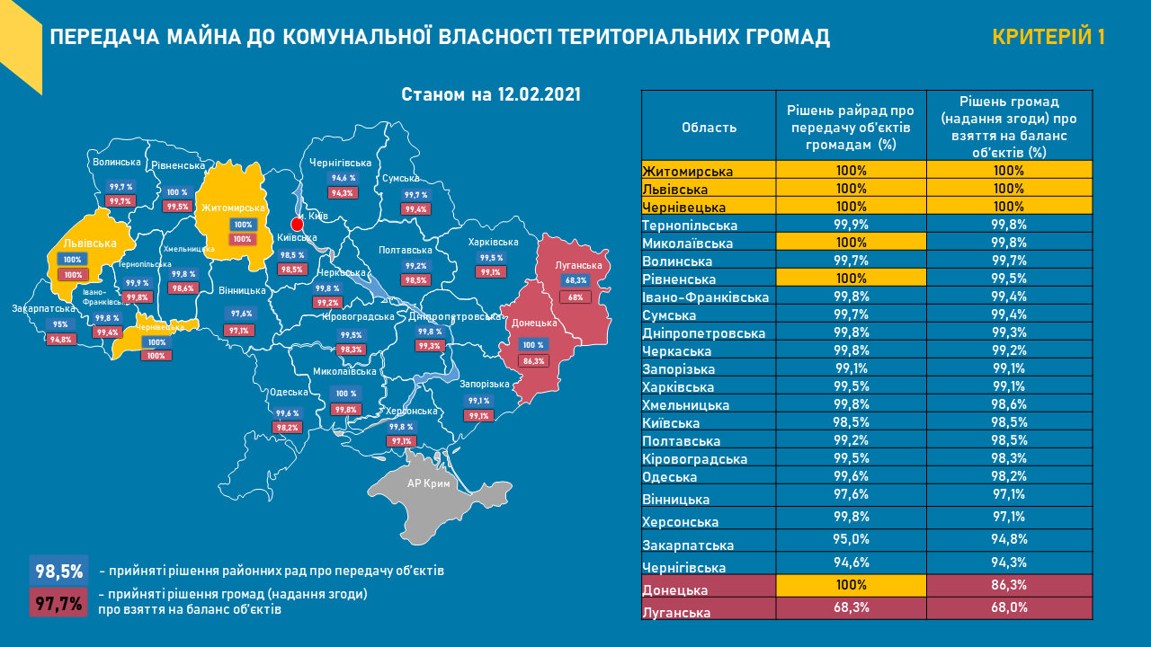Заступник Міністра поінформував, що в регіонах завершується процес передачі майна громадам. 97,7 % всього майна вже вдалося передати. Але 556 об’єктів усе ще не передані. Найбільше проблем виникає по тих об'єктах, які мають заборгованості, тому громади не поспішають брати їх на свій баланс. «В найближчий час треба знайти варіанти виходу з цієї ситуації в тих районах, які не мають грошей на погашення заборгованості», - сказав В’ячеслав Негода.