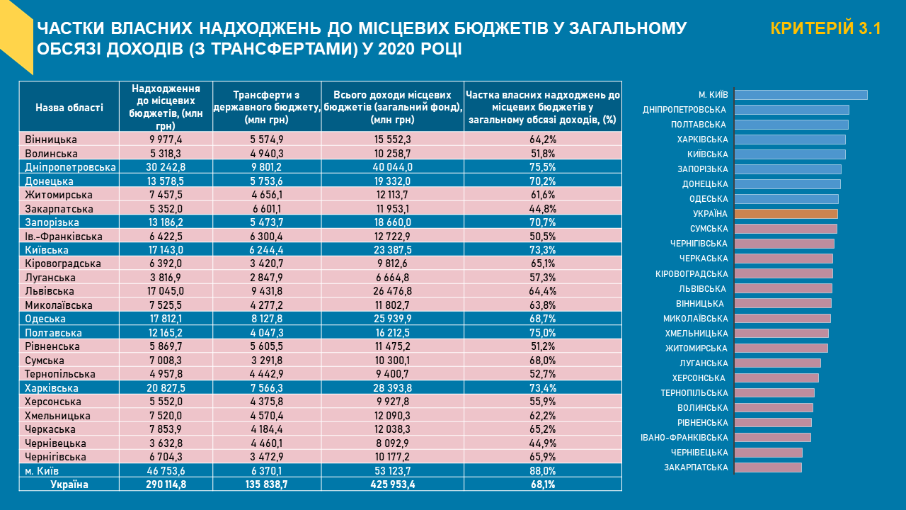 Важливий показник моніторингу - частка власних надходжень місцевих бюджетів. Цей показник говорить про певну спроможність органів місцевого самоврядування. Тобто тим регіонам, які в нижній частині таблиці, ще точно є над чим працювати.