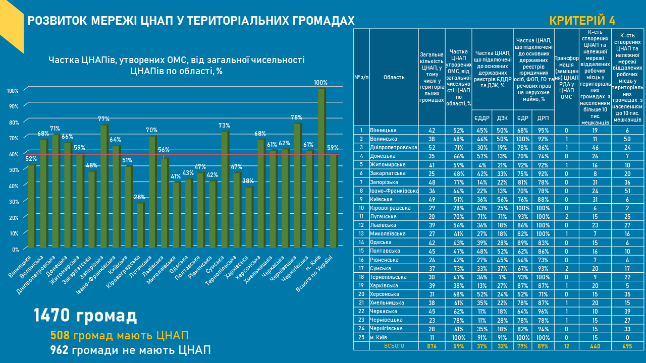 Також заступник Міністра наголосив на непростій ситуації у забезпеченні громад сучасними Центрами надання адміністративних послуг. З 1470 громад лише 508 мають ЦНАП. «Два роки, за які, у відповідності до закону, усі громади повинні створити ЦНАП, - це дуже довго. Треба зробити усе, щоб цього року максимально сформувати ЦНАП в громадах, в тому числі, за рахунок передачі з РДА. Хочу також нагадати, що ЦНАП райдержадміністрацій мають продовжувати працювати і надавати послуги. Звільняти людей і закривати ЦНАП РДА не мають права», - зазначив В’ячеслав Негода.