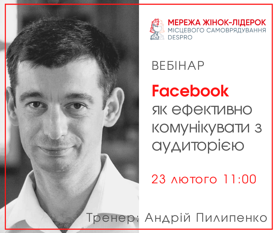 23 лютого о 11:00 розпочнеться вебінар "Facebook - як ефективно комунікувати з аудиторією". Під час зходу, організованого Проектом DESPRO, мова піде про таке.