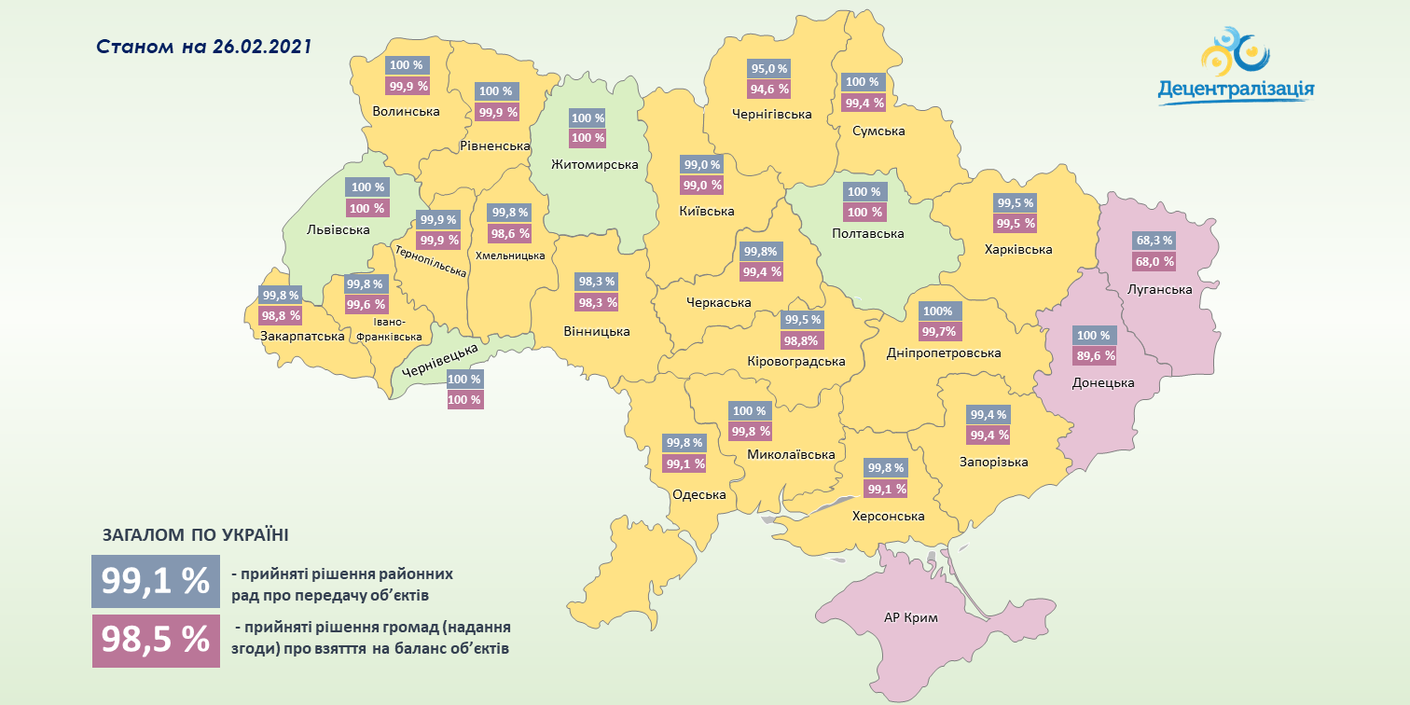 98,5% об’єктів спільної власності територіальних громад району громади вже готові взяти на свій баланс (надали згоду). Такими є дані моніторингу Мінрегіону, станом на 26 лютого 2021 року.
