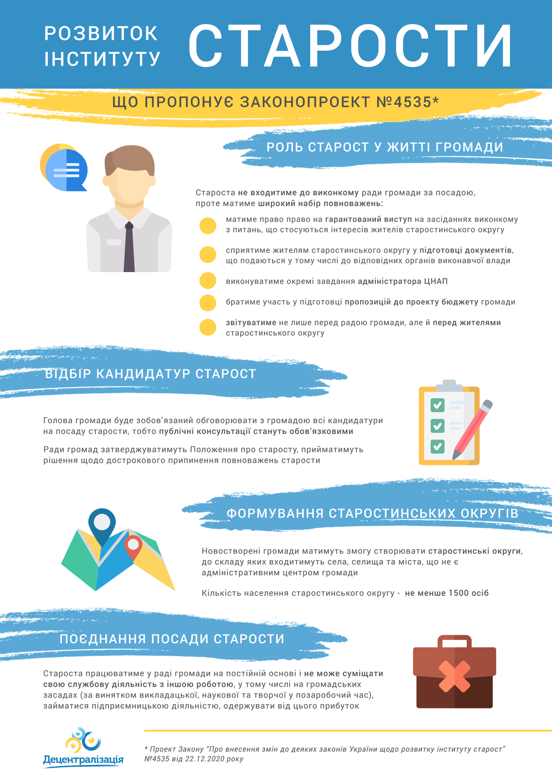 Інші положення законопроекту врегульовують суто технічні питання: порядок створення старостинських округів, затвердження радою громади положень про старосту, суміщення посади старости тощо.