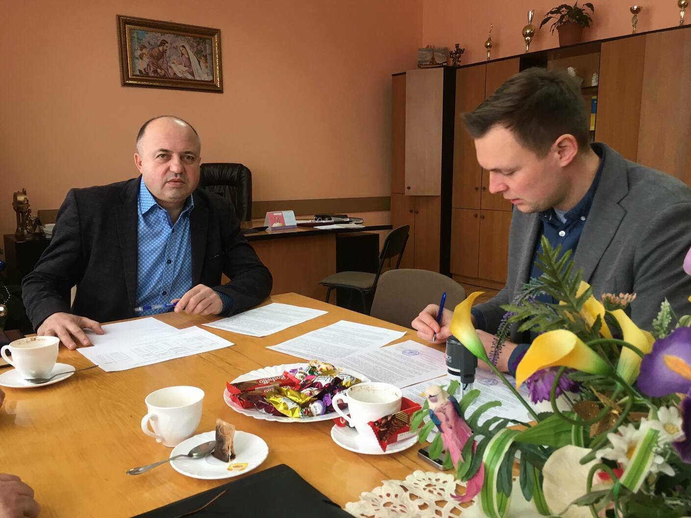 Богдан Келічавий під час підписання мемурандуму про співфінансування Копичинецької лікарні Хоростківською громадою. Ліворуч – голова цієї громади Степан Гладун