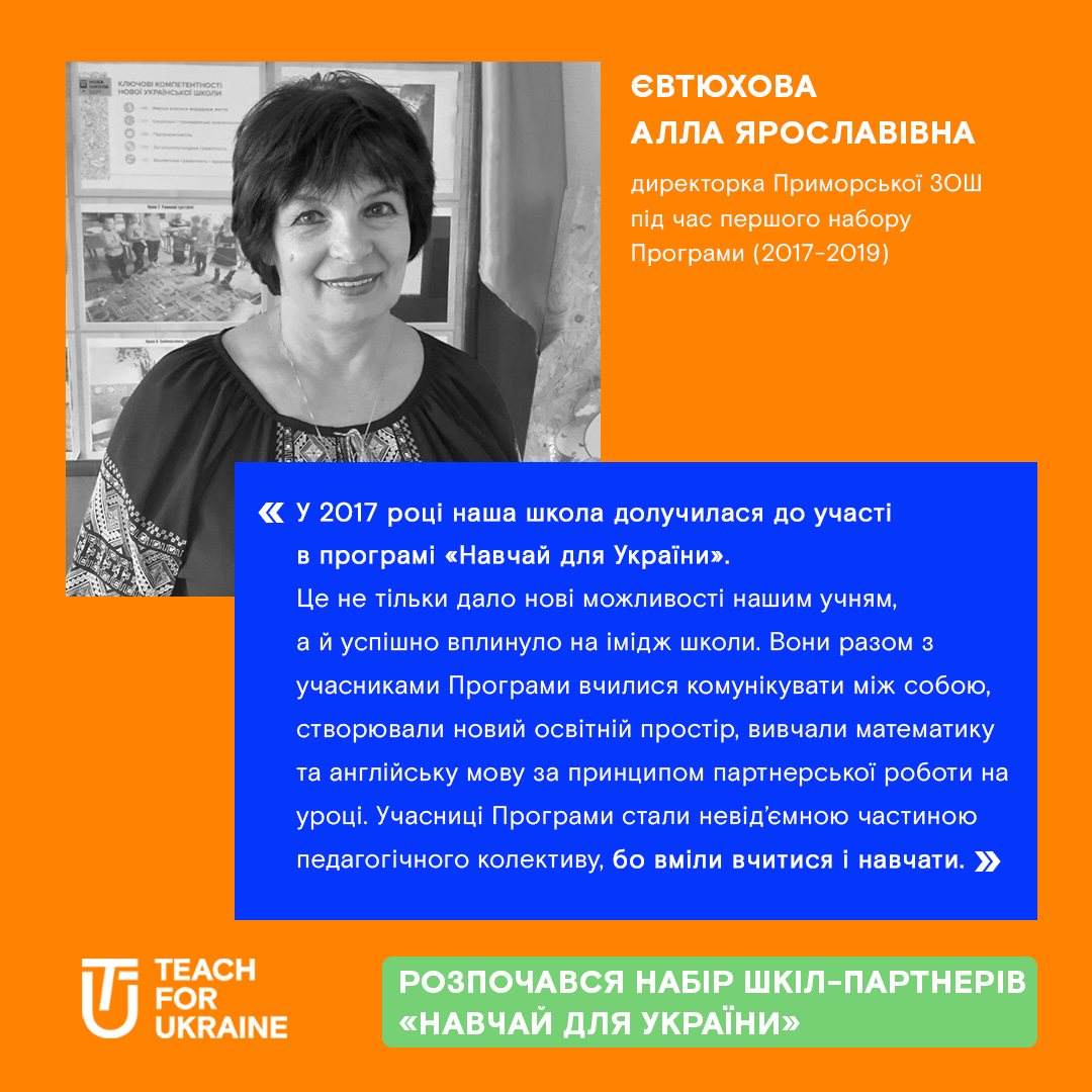 «Навчай для України» - це програма залучення талантів у сферу шкільної освіти на відкриті вакансії вчителів у 5-11 класах. Школи-партнери програми приймають у свій колектив одного або кількох молодих вчителів, які протягом 2 років викладатимуть один зі шкільних предметів, організовуватимуть позакласні ініціативи для школярів та громади.