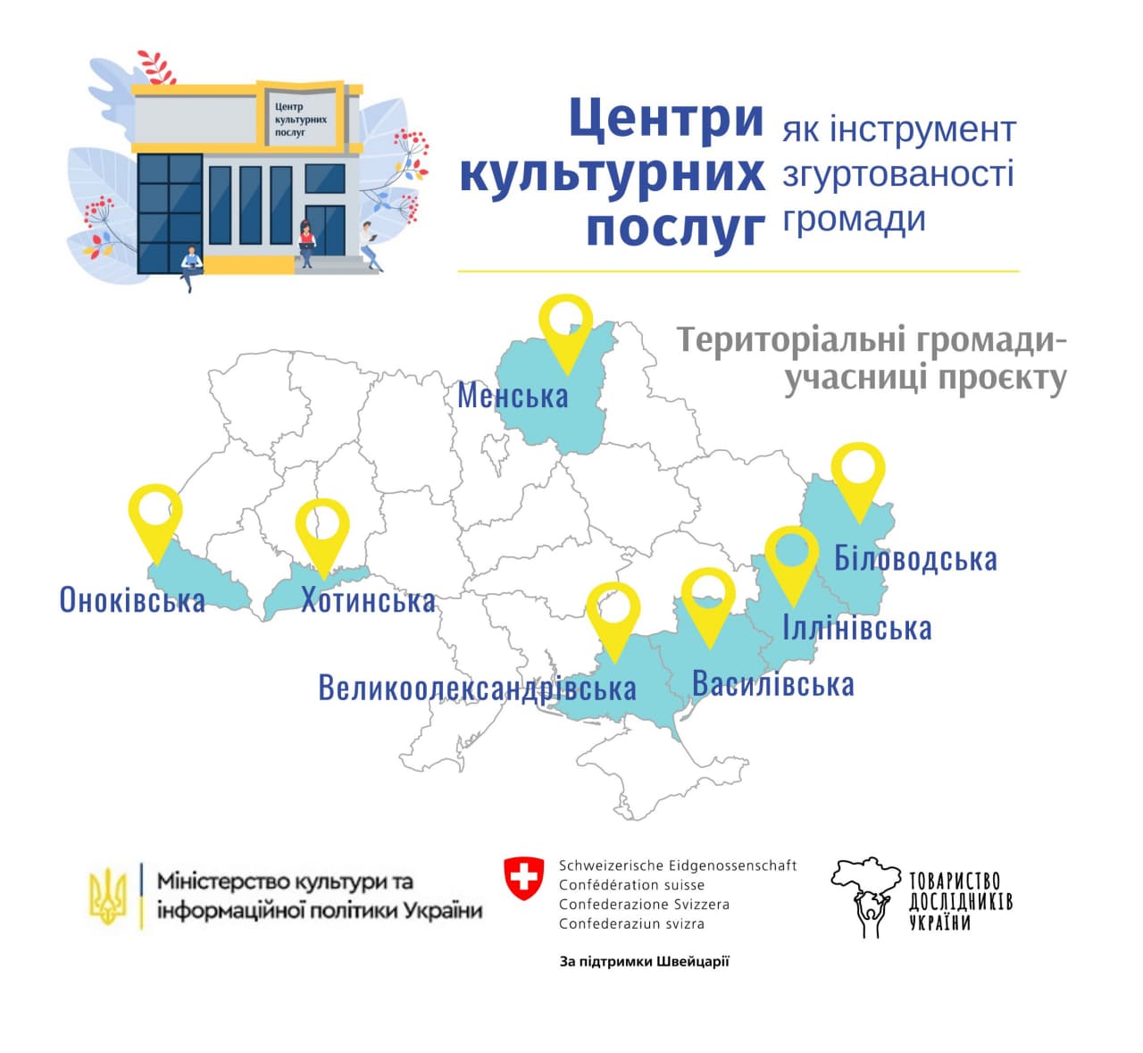 2 квітня завершився відбір територіальних громад до участі в проєкті «Центри культурних послуг, як інструмент згуртованості громади», який реалізує громадська організація «Товариство дослідників України», за ініціативи Міністерства культури та інформаційної політики України та підтримки Швейцарії, що надається через Швейцарську агенцію розвитку та співробітництва (SDC).