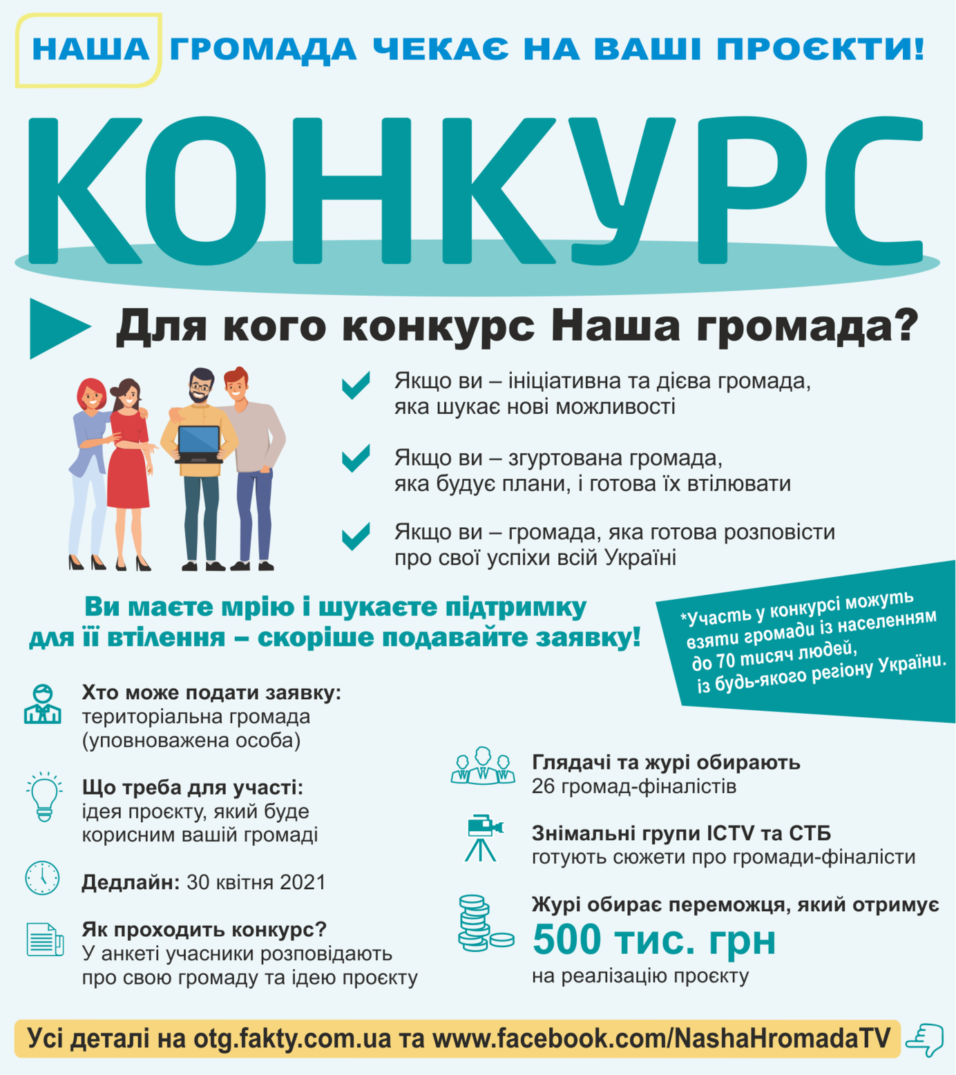 Стартував конкурс проєктів “Наша громада”, які стимулюватимуть та підтримуватимуть розвиток територіальних громад. Дієві згуртовані громади мають шанс виграти головний приз конкурсу - пів мільйона гривень на втілення важливої, актуальної місцевої ініціативи, яка сприятиме розвитку територіальної громади. Окрім того, 26 громад-фіналістів конкурсу отримають медійну підтримку, адже них зніматимуть сюжети ICTV та СТБ.