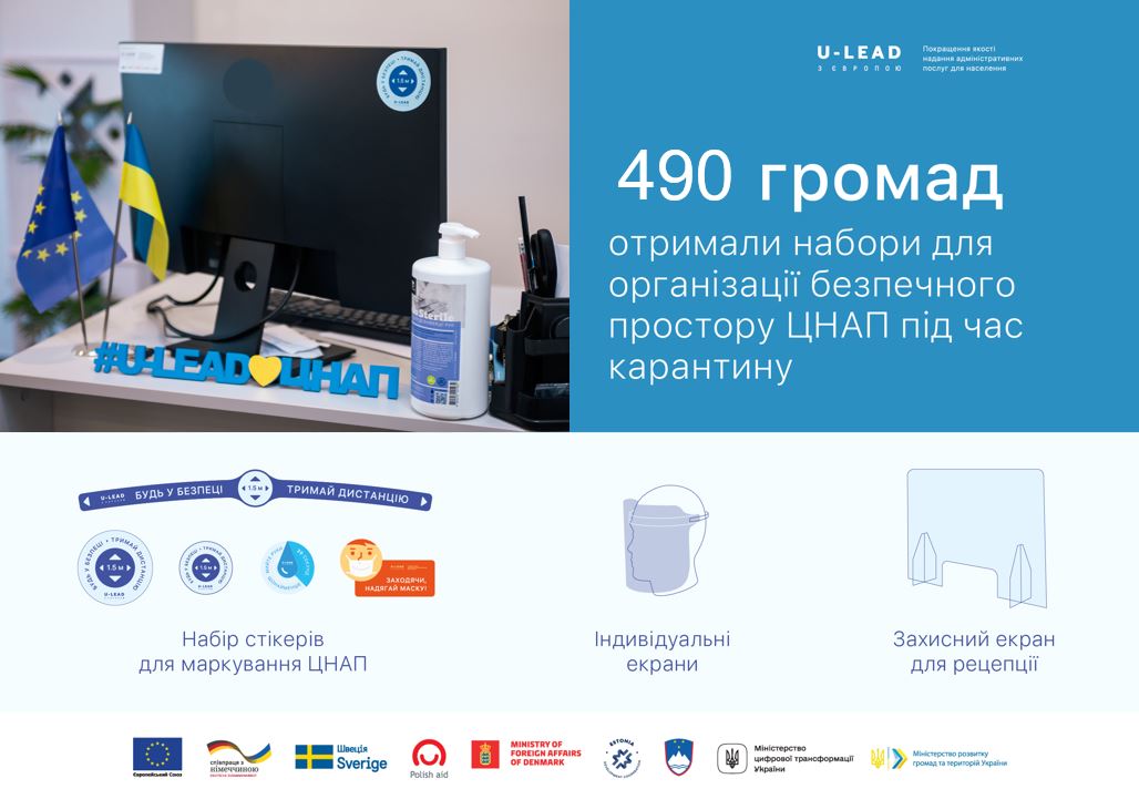 Програма ЄС «U-LEAD з Європою» продовжує допомагати ЦНАП дотримуватися правил безпеки під час карантину. Станом на 20 квітня, ще 130 центрів надання адміністративних послуг (ЦНАП) у громадах отримали набори маркування та захисту, які допоможуть дотримуватися карантинних обмежень під час пандемії COVID-19. Оснащення надала Програма «U-LEAD з Європою», що фінансується ЄС та його країнами-членами: Німеччиною, Швецією, Польщею, Данією, Естонією та Словенією.