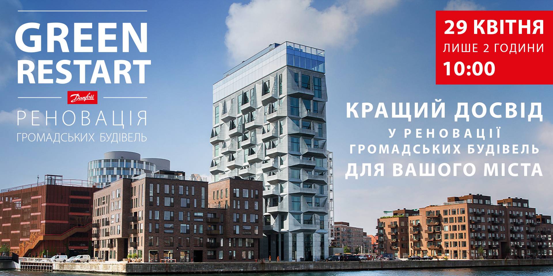 Компанія Danfoss Україна запрошує 29 квітня о 10.00 приєднатися до спеціалізованої онлайн-конференції «Green Restart: Реновація громадських будівель», що збирає кращий досвід та проговорює труднощі, з якими стикался східноєвропейські муніципалітети (з України, Польщі та Литви) у робудові енергоефективного муніципального сектора.