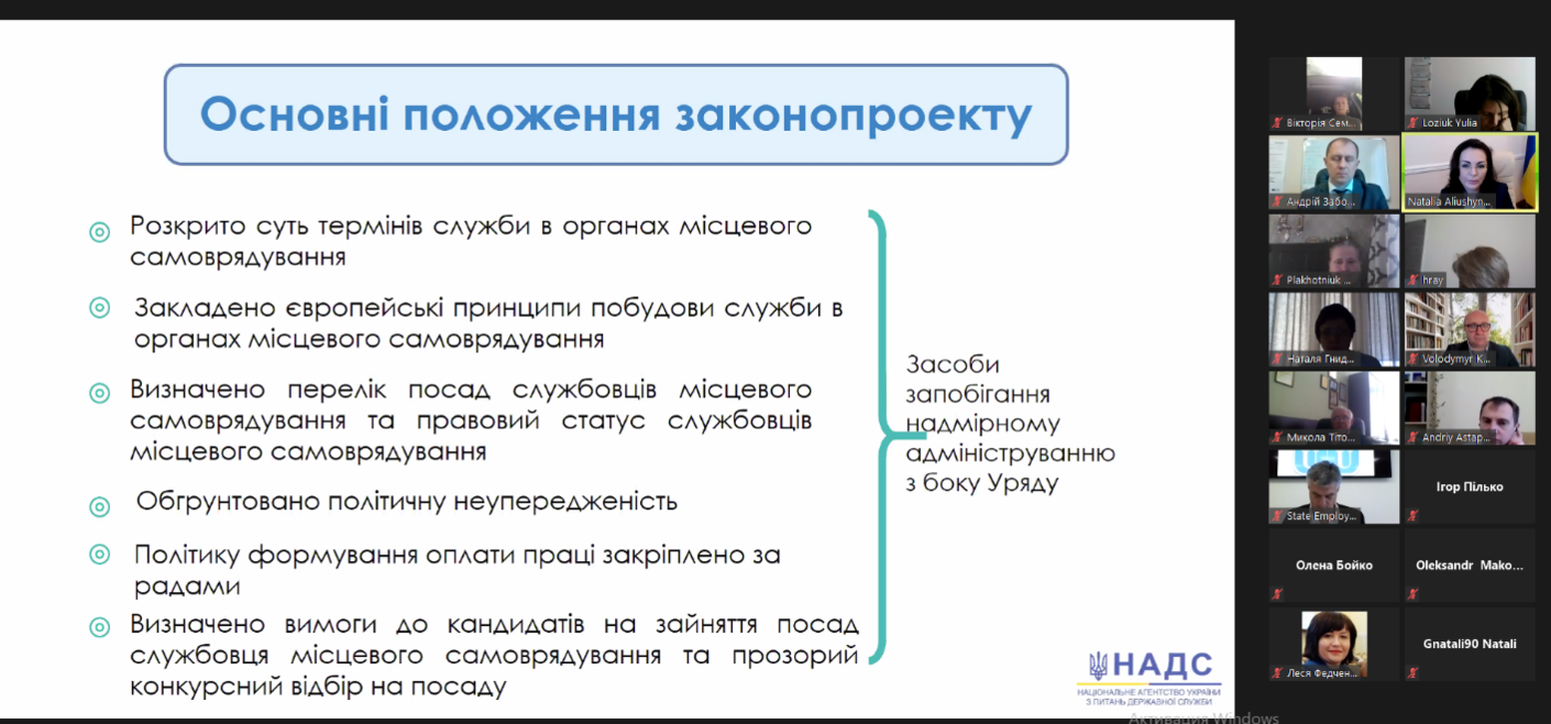 Під час першої зустрічі Голова НАДС Наталія Алюшина представила напрацювання Агентства для обговорення, які ляжуть в основу нової редакції Закону «Про службу в органах місцевого самоврядування».