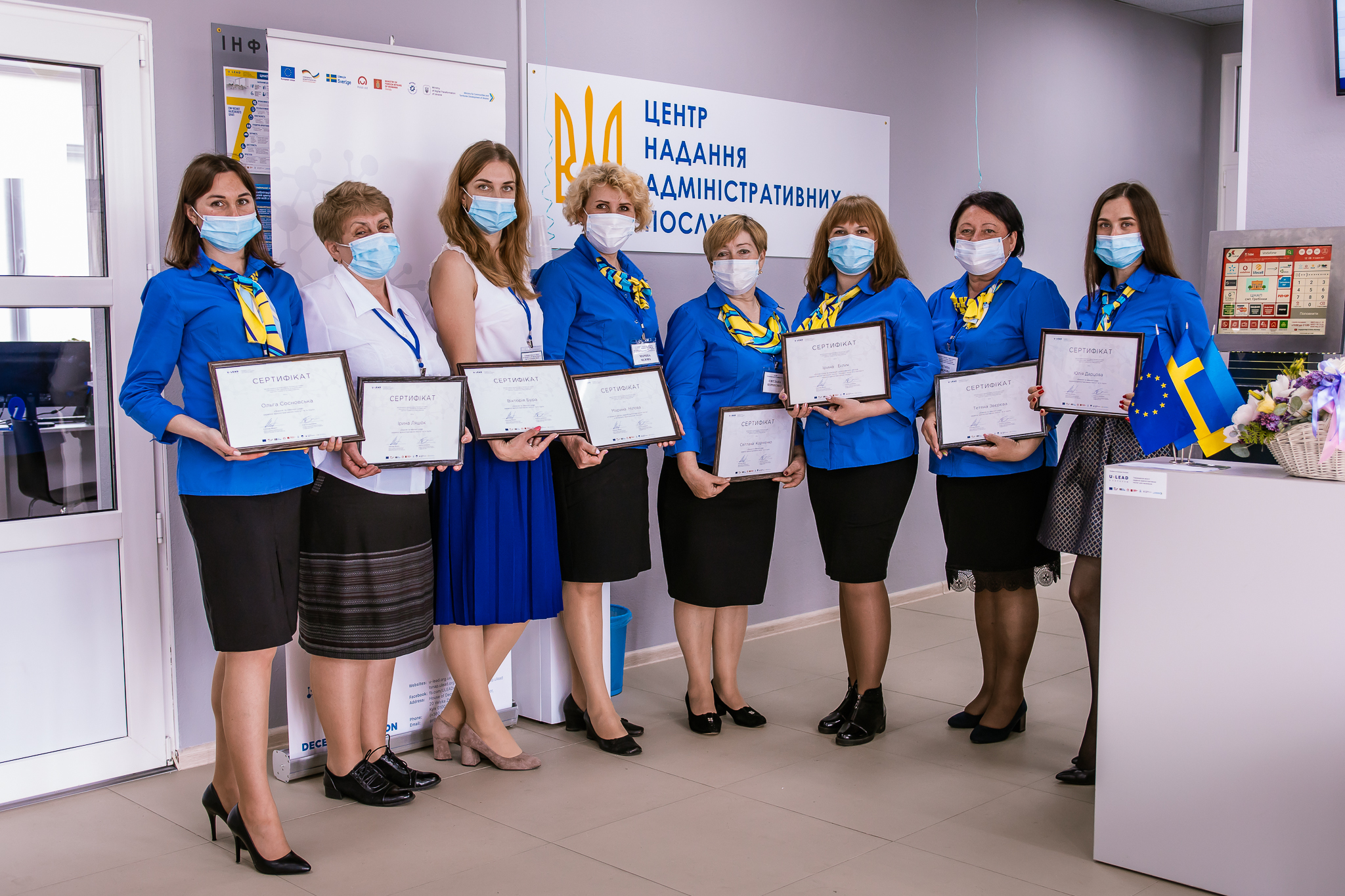 Всі працівники ЦНАП пройшли навчання, розроблене експертами Програми «U-LEAD з Європою»: п’ять тематичних модулів щодо ролі органів місцевого самоврядування в обслуговуванні громади, порядку надання окремих груп адмінпослуг, ділової етики, гендерних питань.