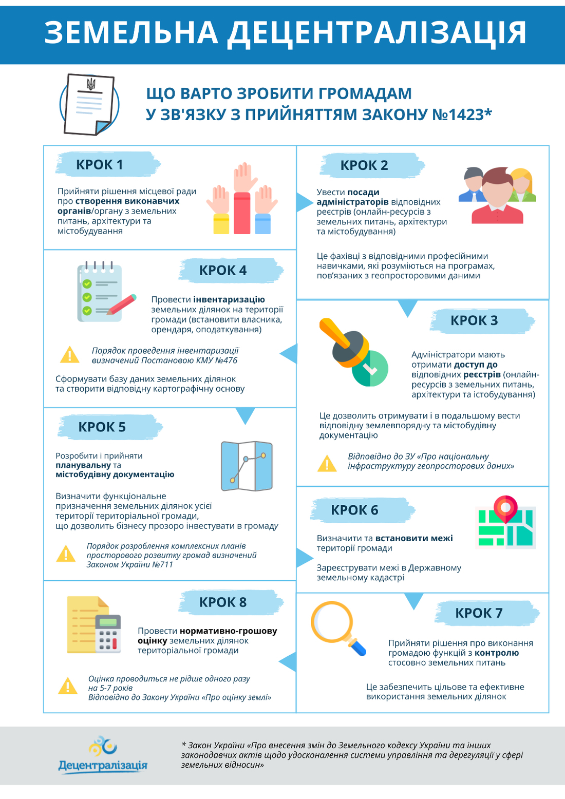 У зв’язку з цим, портал «Децентралізація» спільно з Мінрегіоном підготували короткі рекомендації для громад - які першочергові заходи варто здійснити у зв’язку з новим земельним законодавством.