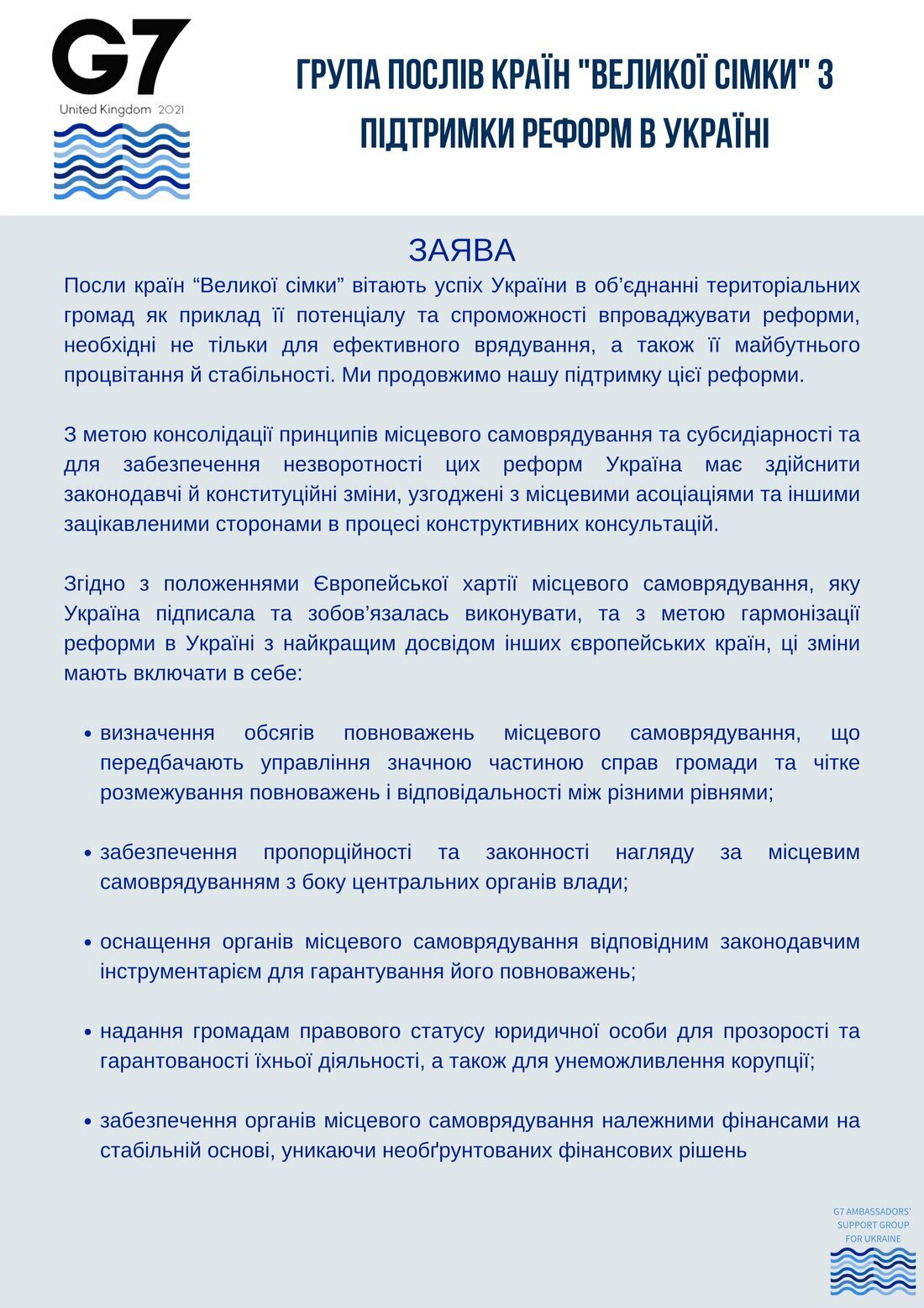 Група послів країн "Великої сімки" (G7) привітала успіх України в об'єднанні територіальних громад як приклад її потенціалу та спроможність впроваджувати реформи, необхідні не лише для ефективного врядування, а також для майбутнього процвітання і стабільності.