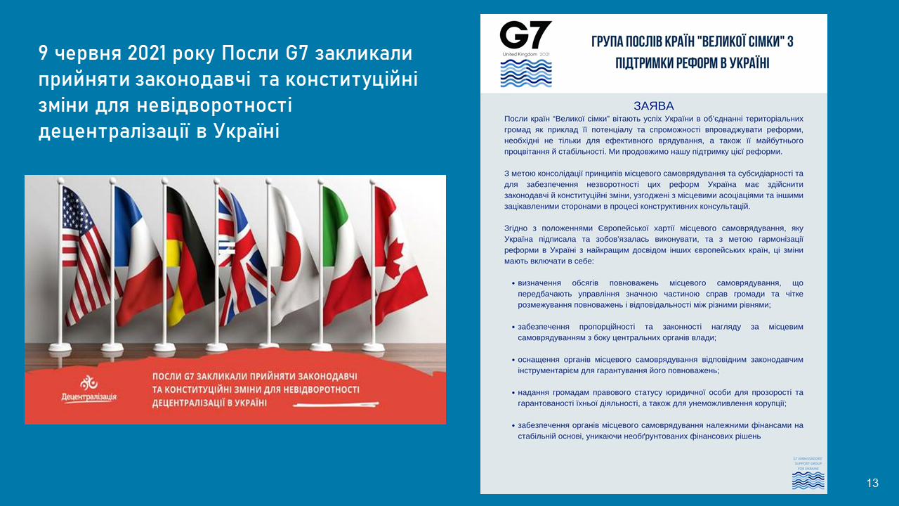 «І ця позиція, на щастя, однозначна. В лютому цього року Європейський Парламент визнав децентралізацію однією з найуспішніших реформ в Україні. Також цього тижня Група послів країн "Великої сімки" (G7) привітала успіх України в об'єднанні територіальних громад. Це також свідчить, що на попередніх етапах реформи ми робили правильні кроки, як би важко і непопулярно часом це не було. А от чи вдасться нам, успішно завершити реформу, залежить великою мірою від рішень Верховної Ради і активності самих громад, які мають бути зацікавлені, щоб їхній статус, права і ресурси були захищені Конституцією і не залежали від змін центральної влади», - сказав заступник Міністра.