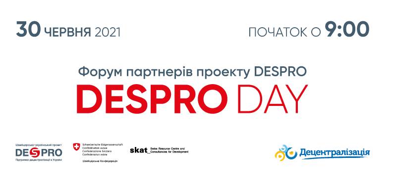 30 червня 2021 року відбудеться Форум партнерів проекту DESPRO «DESPRO DAY», під час якого буде обговорено подальші кроки впровадження реформи місцевого самоврядування в Україні, а також підведено підсумки діяльності проекту щодо підтримки реформи.