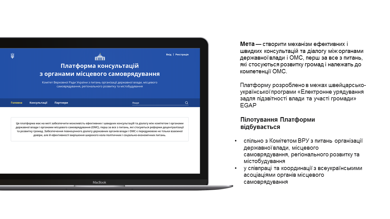 Презентуючи платформу, старша координаторка програм Посольства Швейцарії в Україні Ілона Постемська зазначила: «Ми раді сприяти подальшій підтримці децентралізації і впровадження інструментів електронної демократії в Україні – а у цій платформі ці два наших пріоритети поєднались».