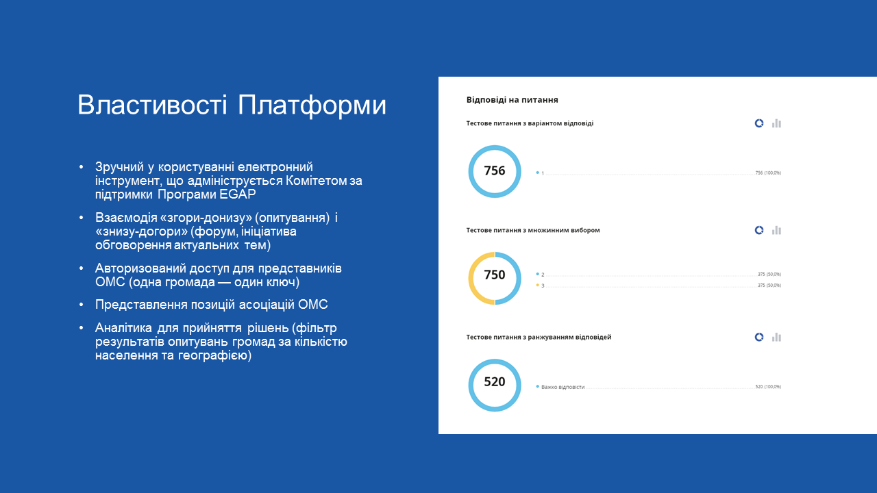 Наразі платформа КОМС запроваджується в пілотному режимі. Невдовзі наш портал представить більш детальну інформацію про неї і запросить міських/селищних/сільських голів до реєстрації на платформі та до участі в перших опитуваннях.