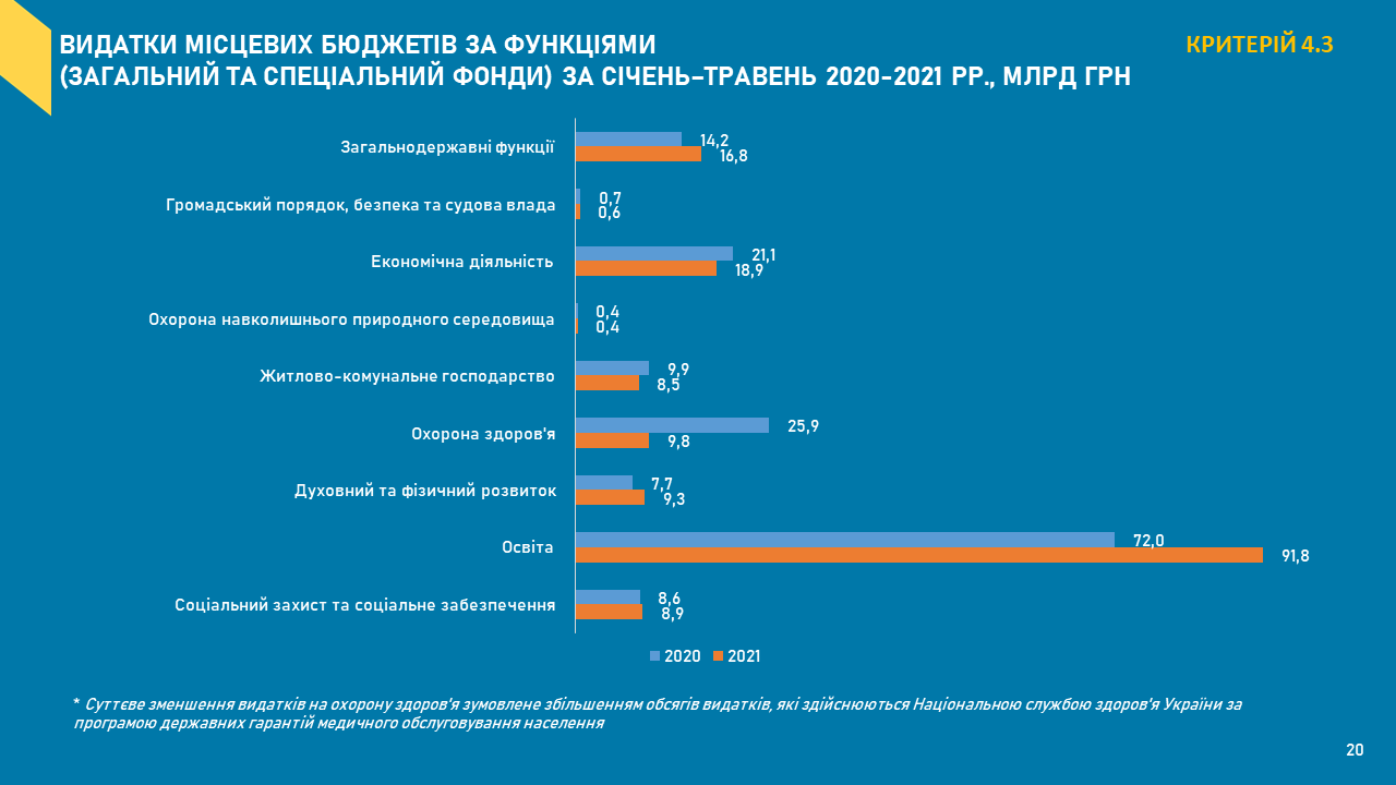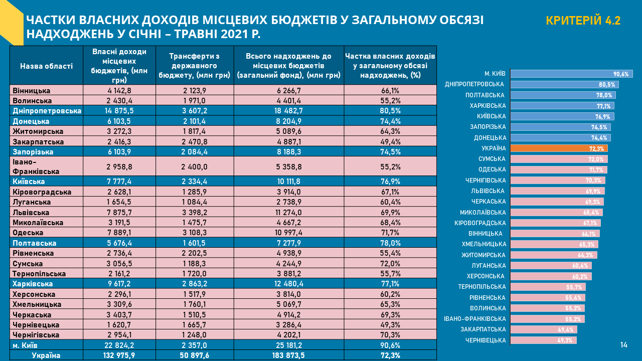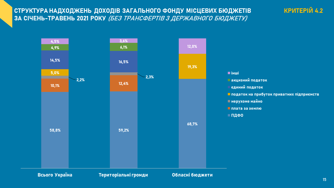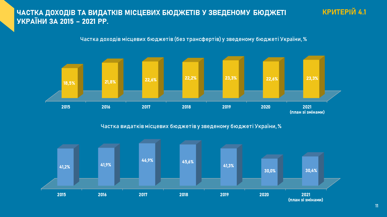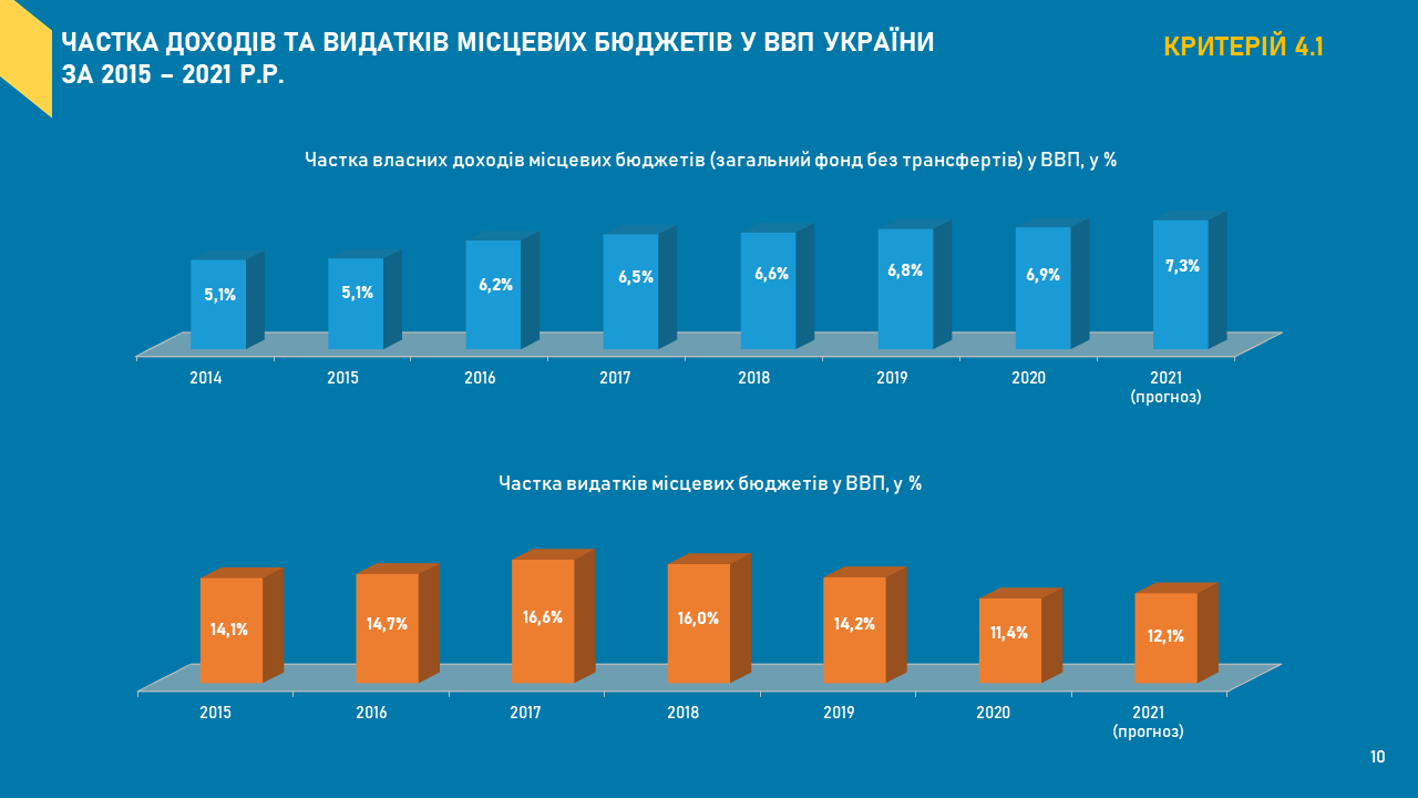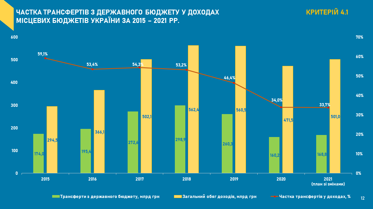 «Факт перший: частка власних доходів місцевих бюджетів відносно ВВП постійно зростає - за підсумками 2020 року вона склала 6,9%, у 2021 році прогнозується на рівні 7,3%. Нагадаю, що до початку реформи, у 2014 році, вона становила 5,1%. Факт другий: поступове зменшення залежності місцевих бюджетів від трансфертів з державного бюджету та підвищення їх автономності. На сьогодні, частка трансфертів у загальному обсязі доходів місцевих бюджетів складає 33,7%. У 2014 році цей показник складав майже 60%. Це обумовлено, насамперед, розширенням фіскальної бази та посилення зацікавленості громад у нарощуванні дохідної бази, розширенням їх повноважень у цій сфері. Більше власних надходжень – більше самостійних рішень громад щодо їх використання, держава в цей процес не втручається», - прокоментував В’ячеслав Негода.