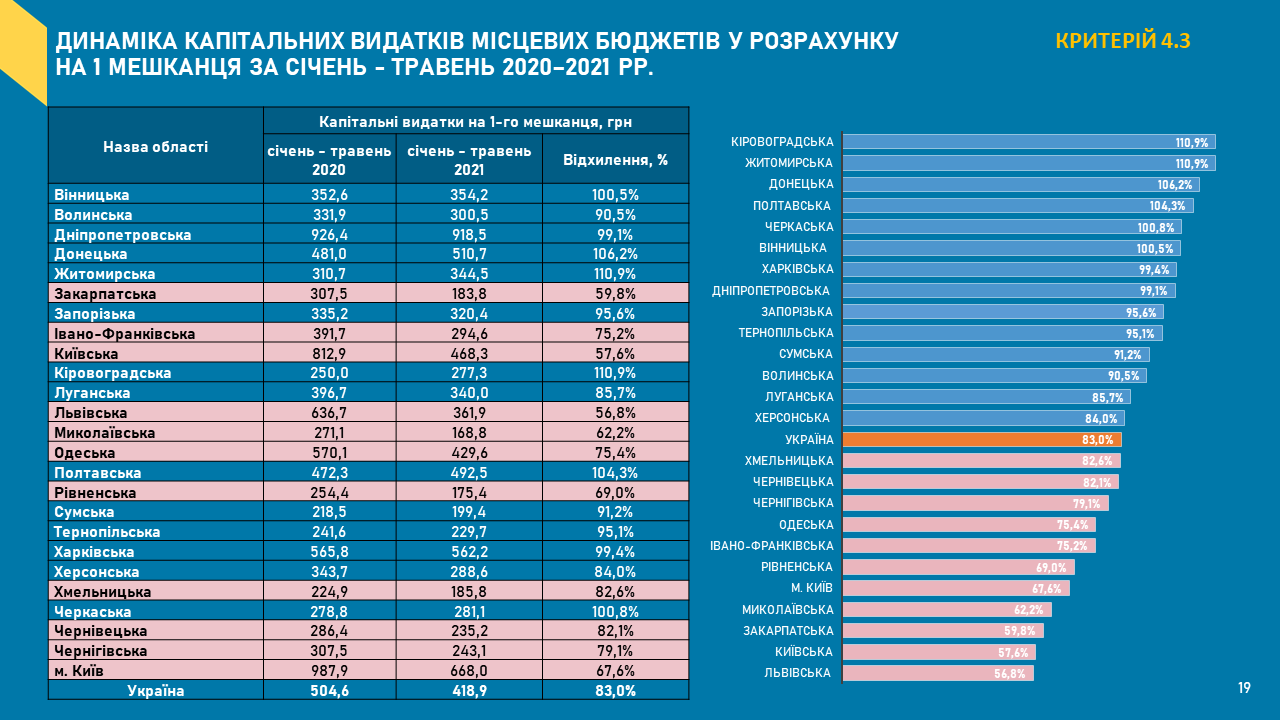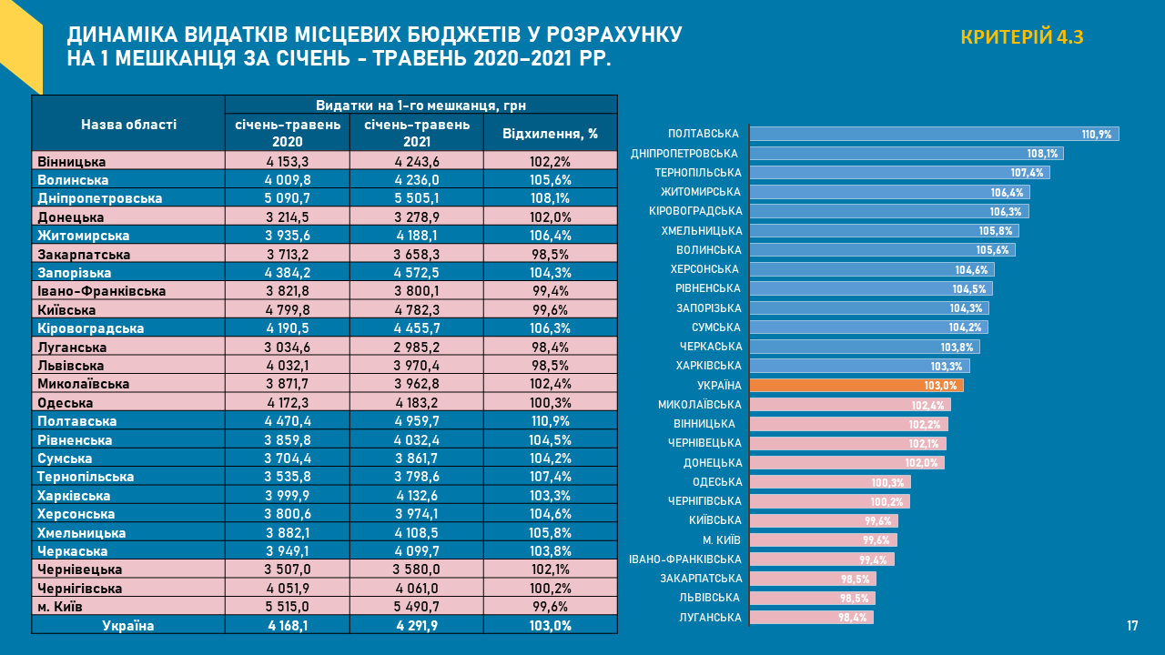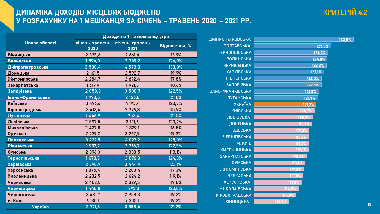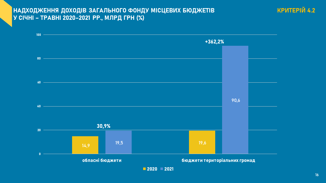 Економічна активність в громадах, після тривалих карантинних обмежень, поступово відновлюється. Упродовж січня-травня 2021 року зафіксовано динамічне зростання доходів місцевих бюджетів. Якщо порівнювати з аналогічним періодом минулого року, то обсяг надходжень до загального фонду (без урахування трансфертів з державного бюджету) зріс на 21,2% і склав 133 млрд грн. Про це свідчать дані Моніторингу реформи місцевого самоврядування та територіальної організації влади, проведеного Мінрегіоном (ЗАВАНТАЖИТИ 3,5 МБ)