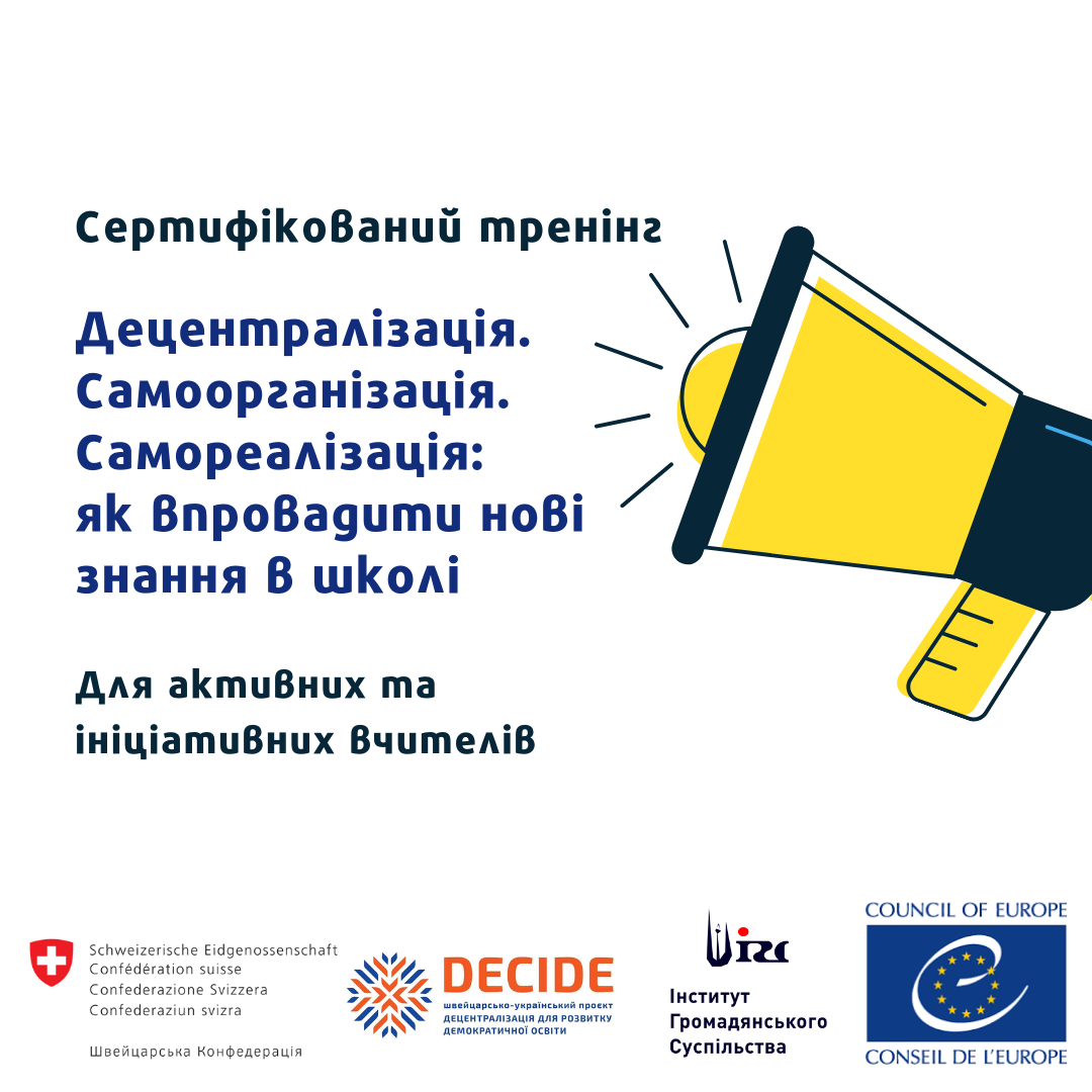 Інститут громадянського суспільства запрошує заклади загальної середньої освіти та їх ініціативних вчителів з Полтавської, Одеської та Івано-Франківської областей, зацікавлених у професійному розвитку та формуванні нових компетенцій та навичок до участі у триденному тренінгу «Децентралізація. Самоорганізація. Самореалізація: як впровадити нові знання в школі».