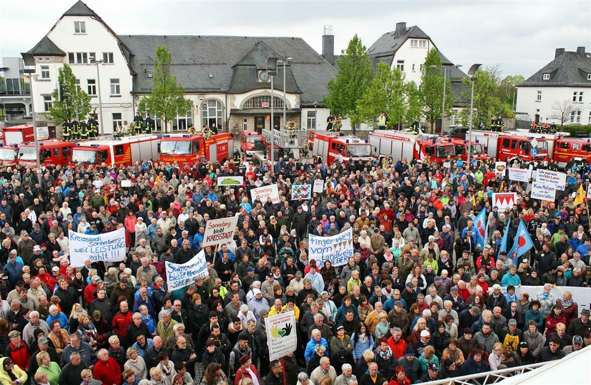 Зміна місцевих кордонів може виявитись дуже емоційним процесом. Навесні 2017 року в деяких містах Східної Німеччини відбулися найбільші політичні мітинги після знаменитих «понеділкових демонстрацій» 1989 року, коли громадяни вийшли на марш проти комуністичного режиму. На Рисунку 1 зображено протести у маленькому місті Зоннеберг, де тисячі людей зібралися на ринковій площі. Протести були спрямовані проти планів центрального уряду щодо примусового об’єднання органів місцевого самоврядування. Дедалі більше громадян збиралися на мітинги, подавали петиції та підтримували прямі демократичні ініціативи. Опитування показали, що 69% населення Східної Німеччини проти нової реформи укрупнення, тільки 25% підтримали цю ініціативу[2]. Після декількох місяців протестів, що постійно зростали, і злету підтримки популістських партій на загальнонаціональних виборах центральний уряд скасував усі плани щодо примусового об’єднання в кінці 2017 року.