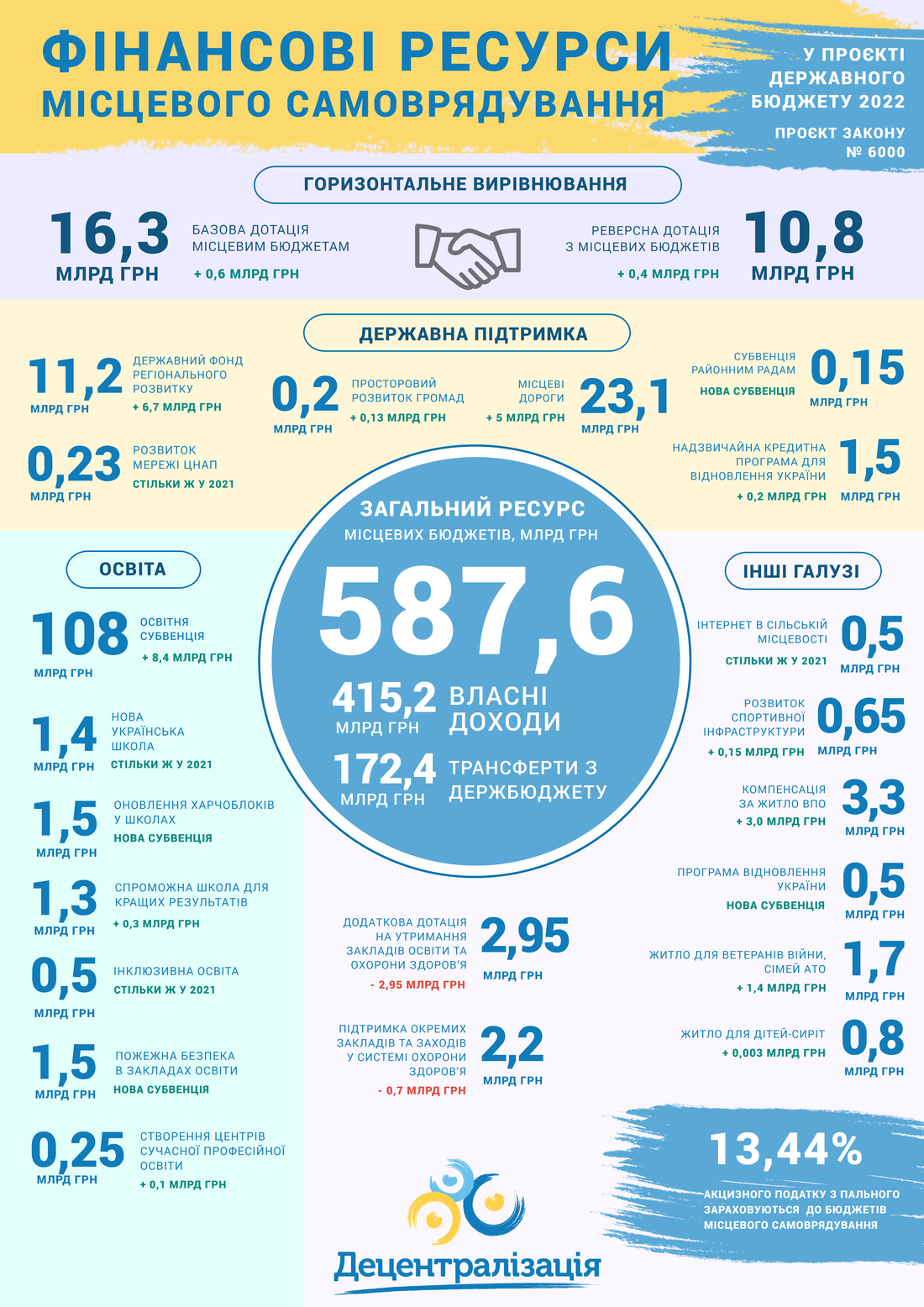 Портал «Децентралізація», спираючись на дані, виокремлені з Проєкту Закону фахівцями Мінрегіону, підготував інфографіку про основні фінансові ресурси місцевого самоврядування у проєкті Державного бюджету 2022 року.
