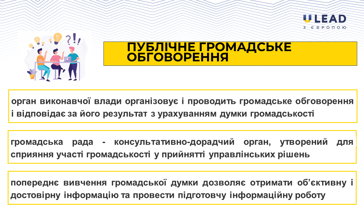 У попередньому матеріалі щодо громадського обговорення ми говорили про те, що таке громадське обговорення і у яких формах воно може відбуватися. В цьому матеріалі ми розглянемо: