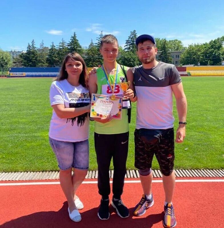 Роман Жменьковський з тренером Андрієм Сахутою і мамою Наталією