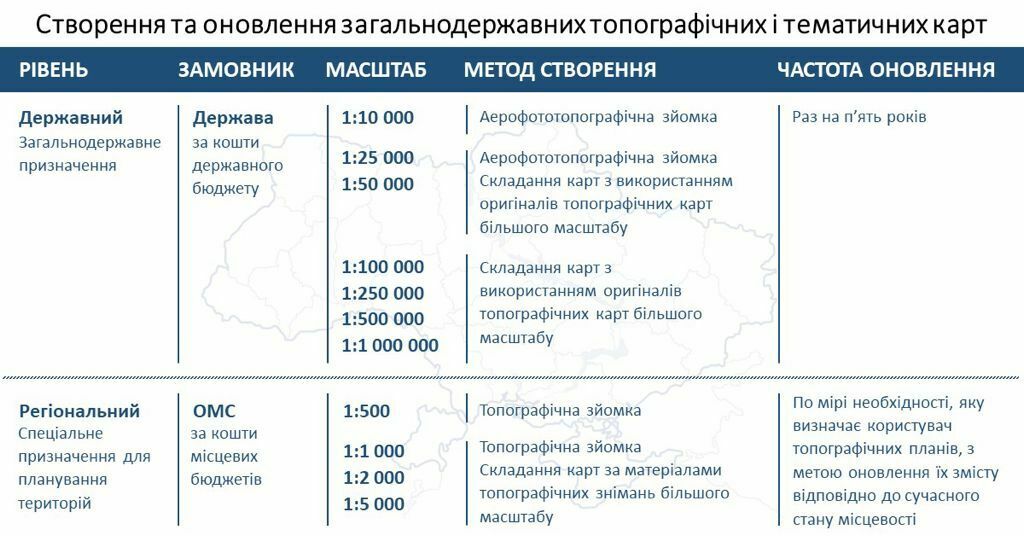 Згідно із Законом України «Про топографо-геодезичну і картографічну діяльність» створення та оновлення державних топографічних карт і планів належить до загальнодержавних топографо-геодезичних і картографічних робіт, виконання яких фінансується за рахунок Державного бюджету України.