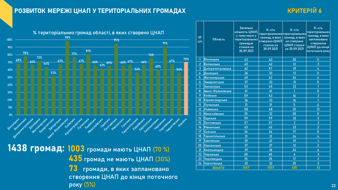 Всього в Україні діє 1047 ЦНАПів, з яких 1003 – в територіальних громадах. До кінця 2021 року в громадах мали б почати роботу ще 73 центри надання адміністративних послуг.
