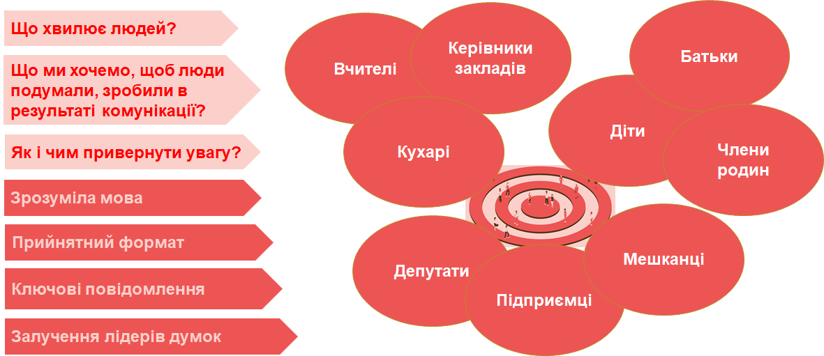 Зазвичай, коли ми говоримо про комунікацію, то, насамперед, маємо на увазі такі поняття як зв'язок, залучення спілкування, взаємодія тощо. Але для органів місцевого самоврядування комунікація має ще один важливий аспект – можливість впливати на те, як громадськістю будуть прийняті та підтримані ініціативи та дії ОМС. Тому для успішної комунікації змін у шкільному харчуванні, варто проаналізувати цільові аудиторії, тобто групи людей, з якими ми хочемо спілкуватися, зрозуміти їхні потреби і мотивацію. Це допоможе сформувати підхід до системної комунікації з різними цільовими аудиторіями з урахуванням факторів, які є для них важливими.