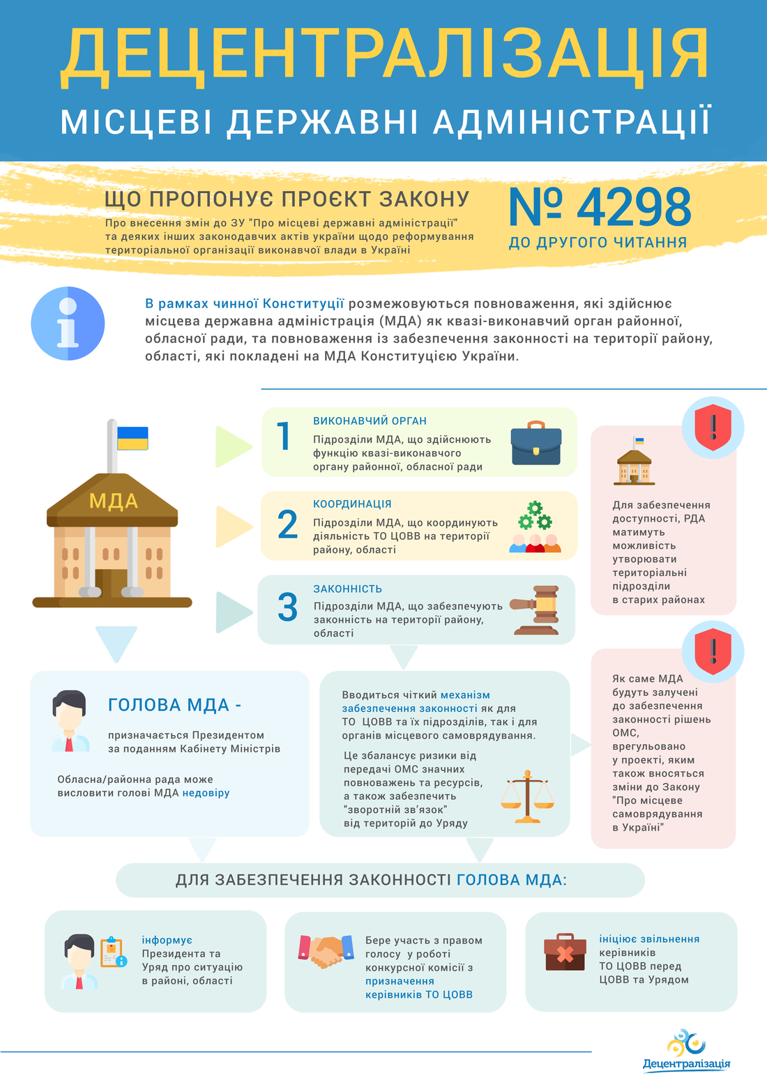 «Перед прийняттям рішення орган місцевого самоврядування матиме право, але не обов’язок, провести попередні консультації з місцевою державною адміністрацію на предмет законності цього рішення. Після консультацій або без них ОМС приймають рішення і оприлюднюють. МДА перевіряє їх і, якщо є підозра на порушення законодавства, звертається до органу місцевого самоврядування з рекомендацією усунути порушення. І лише у разі ігнорування або відмови з боку ОМС, адміністрація має право звернутися до суду. Отже зупинити рішення ОМС може лише суд. Єдиний виняток - якщо рішення ОМС загрожує територіальній цілісності, МДА зупиняє його одразу. Це важливо для нашої країни, яка вже 7 років воює».