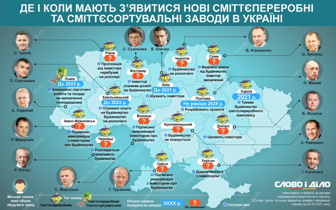 З 1 січня 2018 року в Україні діє заборона на захоронення неперероблених побутових відходів. Штраф за порушення такої норми для населення сягає від 340 до 1360 грн, а для юридичних осіб – від 850 до 1700 грн. Частково через це, а частково через природне бажання нарешті навести лад зі сміттям, громади почали купувати та встановлювати у себе сміттєсортувальні лінії. У 2012 році таких ліній в Україні, за даними Мінрегіону, було 14, у 2015-му – 26, у 2018-му – 30, а у 2019-му (останні дані) – вже 34. Сміттєсортувальні комплекси у різний час також обіцяли побудувати міські голови Сум, Полтави, Вінниці та інших великих міст.