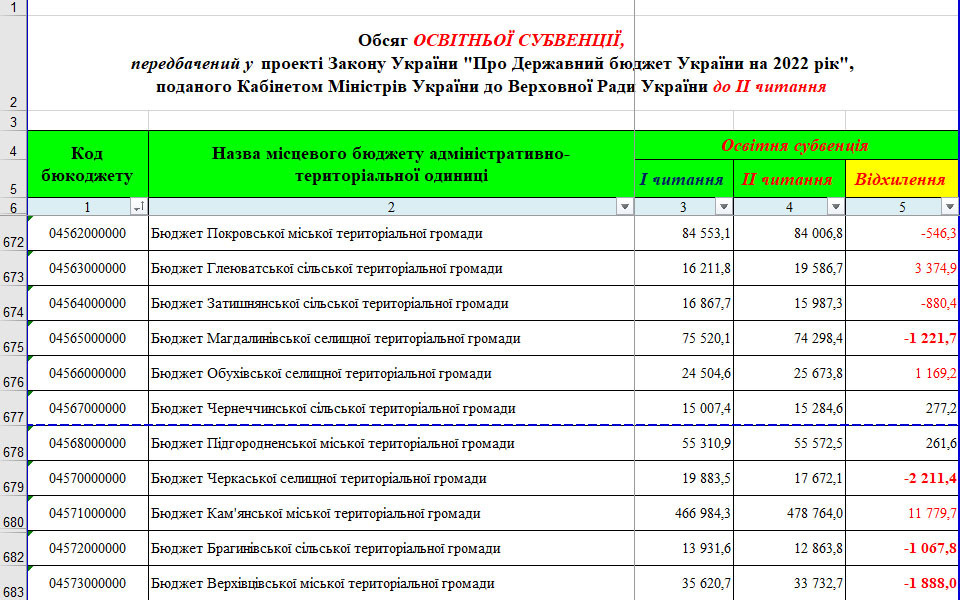 Зрозуміло, що на освітню субвенцію спрямовано найбільшу питому вагу видатків, проте між першим та другим читанням видатки на освітню субвенцію скориговані. Коригування РНК в бюджеті 2022 року застосовано для 744 бюджетів! Слід зауважити, що застосування МОН нових коефіцієнтів щільності та відсотків сільського населення (в 2022 році в таблиці 15 груп), а також актуалізація даних щодо учнівського контингенту призвело до того, що в значної частини територіальних громад зменшився розмір субвенції. Але дивує, що ці ж розрахунки призвели до того, що субвенція зросла (до другого читання), при цьому найбільше зростання відбулось для міст обласного значення.