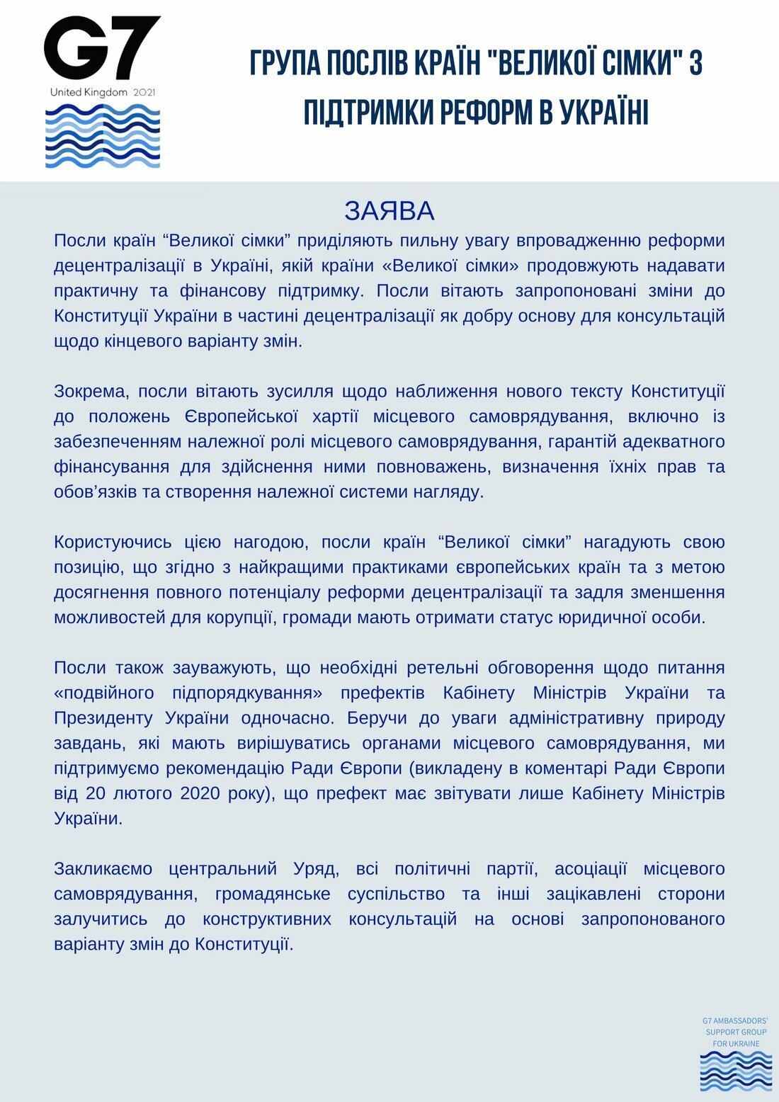 "Закликаємо центральний Уряд, всі політичні партії, асоціації місцевого самоврядування, громадянське суспільство та інші зацікавлені сторони залучитись до конструктивних консультацій на основі запропонованого варіанту змін до Конституції", - зазначається на сторінці послів G7 в Україні у Twitter.