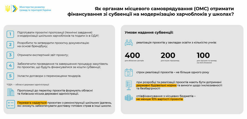 Зазначимо, пропозиції до переліку проєктів формують обласні та Київська міська державні адміністрації. Перевага буде надаватись тим проєктам з реконструкції шкільних їдалень, які внаслідок модернізації зможуть забезпечувати потреби в гарячому харчуванні учнів власної школи, а також доставку гарячих страв в інші освітні заклади.
