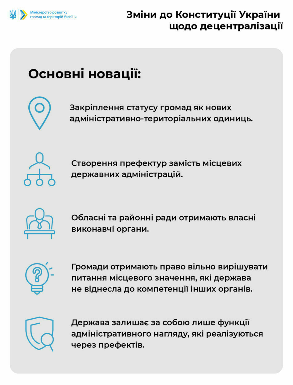 «Серед основних новацій - затвердження громад як нових адміністративно-територіальних одиниць та створення префектур замість місцевих держадміністрацій. Повноваження префекта будуть збалансовані, він не матиме права зупиняти акти місцевого самоврядування без рішення суду, буде державним службовцем і призначатиметься на посаду на 3 роки на конкурсних засадах», — підкреслив Олексій Чернишов